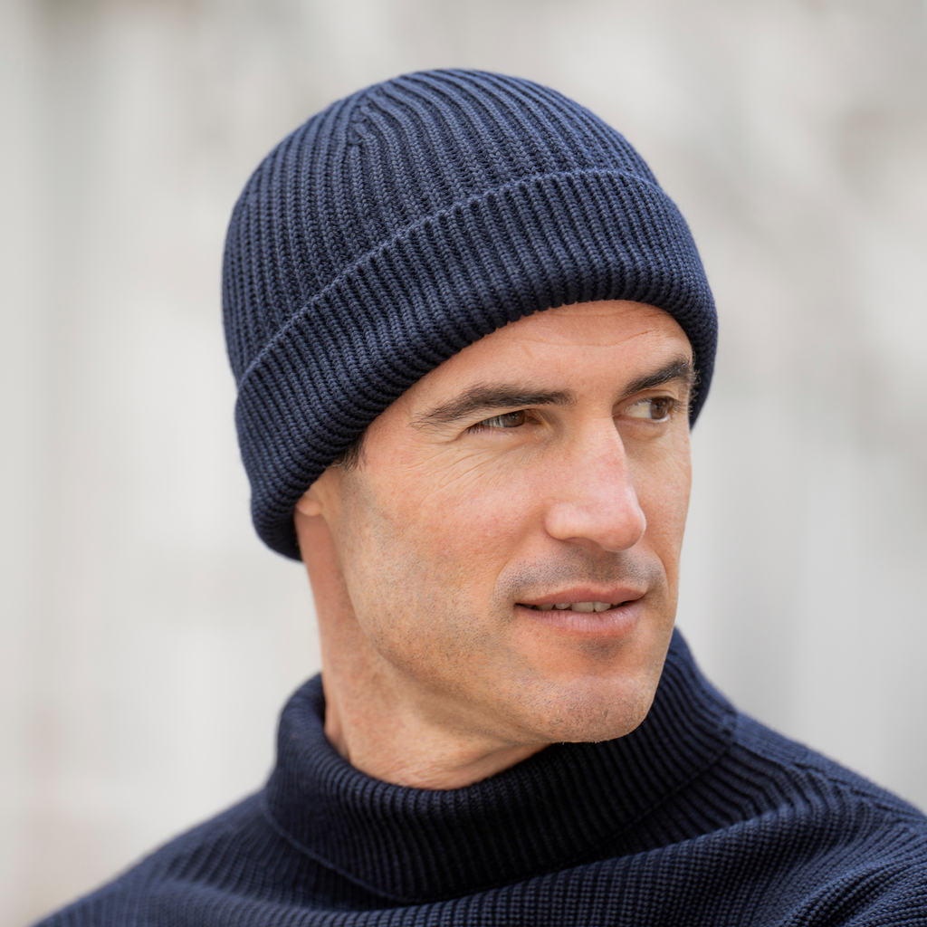 Aus dickem Rippenstrick gefertigte Wollmütze aus reiner Wolle. Das hier verwendete Strickverfahren nennt sich Full-Cardigan: eine spezielle Rippenstrick-Variante mit breiten Zwischenräumen zwischen den einzelnen Rippen, die eine besonders dicke und damit auch besonders formstabile und wärmende, zugleich aber sehr flexible Strickqualität ermöglicht. Reine Wolle aus Patagonien, versponnen und verstrickt in Italien. Einheitsgröße, Höhe ohne Umschlag ca. 26 cm. Für die blaue Variante werden die Wollfasern noch vor dem Verspinnen mit pflanzlichem Indigo gefärbt.