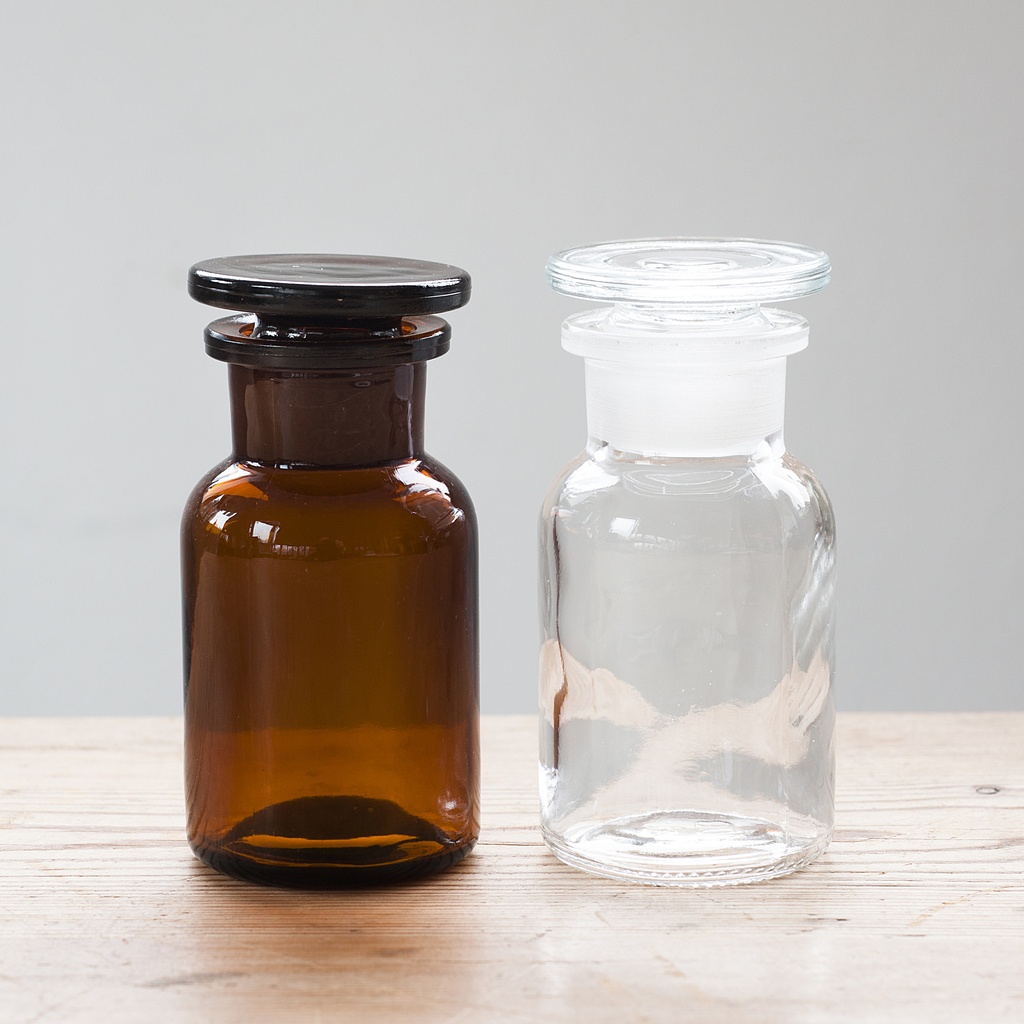 Eine puristische Lösung für die Vorratshaltung in Küche und Speisekammer sind diese Flaschen die in dieser Form seit über 100 Jahren zur Verwendung in Apotheken oder Labors hergestellt werden. Sie sind aus dickwandigem, robustem Glas gefertigt. Verschlossen werden sie mit exakt eingeschliffenen Glasstopfen, die für annähernd luftdichten Verschluß sorgen. Lieferbar sind die Flaschen in weißem oder braunem Glas, wobei braunes Glas den Vorzug hat, daß es die Vorräte zusätzlich vor Lichteinwirkung schützt.