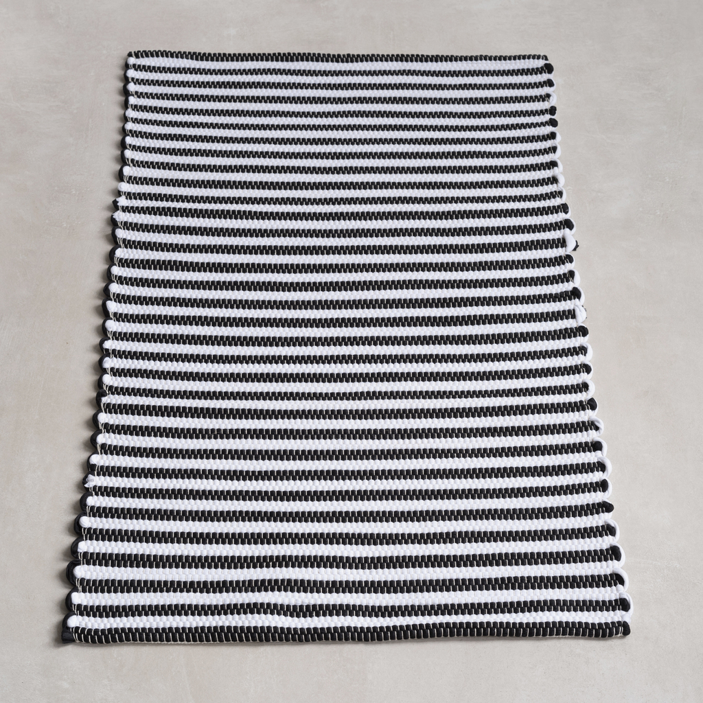 Einfache, solide Badezimmerteppiche mit mediterraner Ausstrahlung, die von Hand auf alten Webstühlen aus breitem Teppichgarn gewebt werden. Verwendet werden wiederverwertete Textilfasern (diverse Faserarten) – die Teppiche sind daher ein echter Beitrag zur Ressourcenschonung. Aus Portugal.