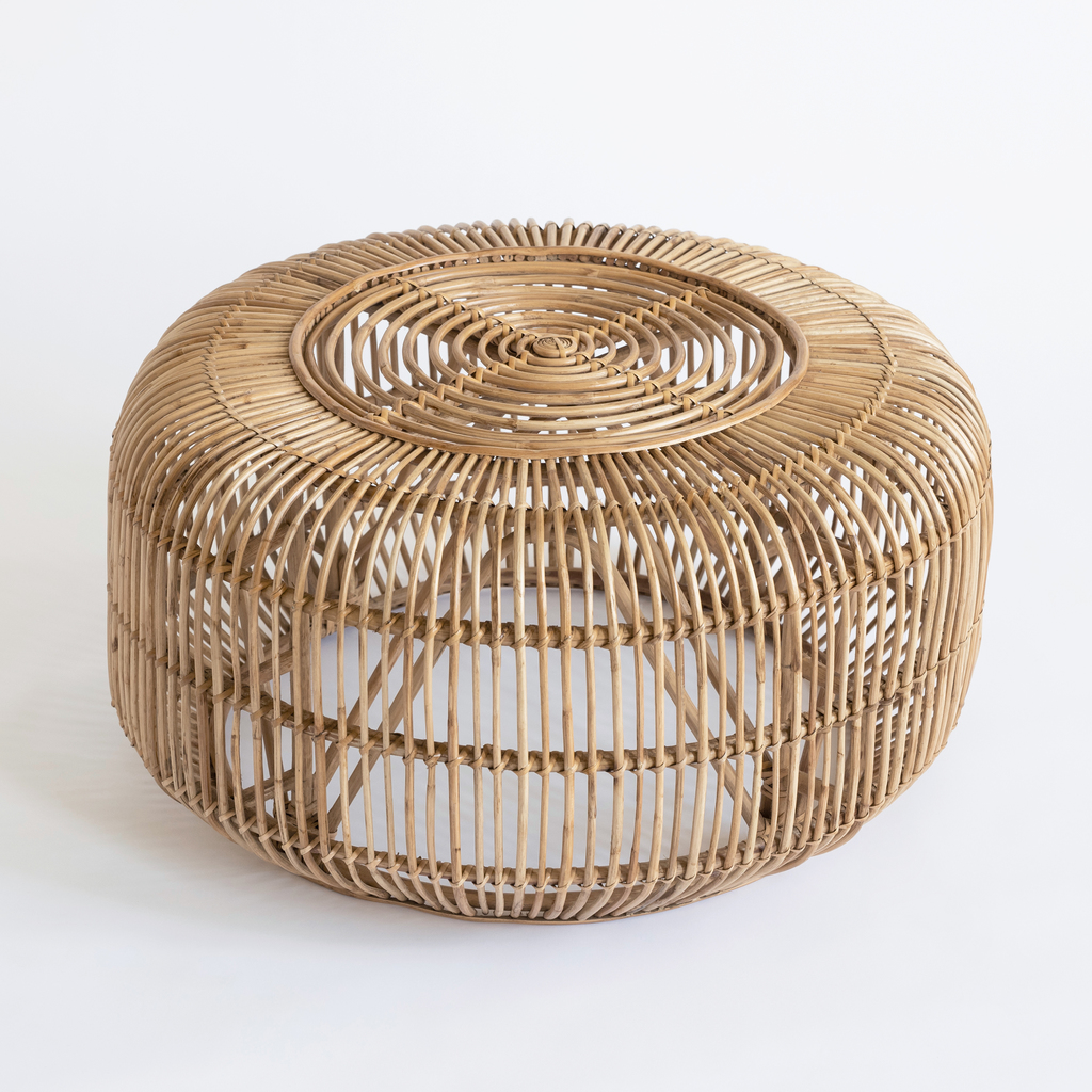 Runder, niedriger Beistelltisch, vollständig von Hand aus Rattanstäben geflochten. Um Gläser auf den Tisch abzustellen, empfehlen wir ein Tablett. Die handwerkliche Rattanverarbeitung hat vor allem in Südostasien eine lange Tradition. Aus dem Stamm und den Lianen der Rattanpalme gewonnen, wird das natürliche Werkmaterial erst dampfgebogen und anschließend weiterverarbeitet. Möbel aus Rattan vereinen eine hohe Stabilität mit erstaunlich geringem Gewicht, Sitzmöbel sind aufgrund der Flexibilität des Materials auch ohne Polster sehr bequem. Rattanmöbel im Garten vertragen ohne Probleme einen Sommerregen, sind aber nicht dauerhaft wetterbeständig und müssen im Winter drinnen gelagert werden. Im Gegensatz zu Bäumen werden Rattanpalmen zur Rohstoffgewinnung nicht abgeholzt. Die schnellwachsende Kletterpflanze wächst nach dem Beschnitt weiter und kann innerhalb weniger Jahre erneut abgeerntet werden.