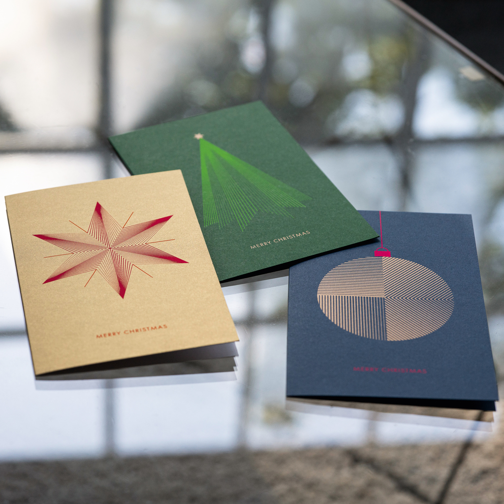 Grußkarten im großzügigen Diplomatenformat mit geometrisch gestalteten Weihnachtsmotiven auf farbig schimmerndem Karton. Durch das grafische Liniendesign entwickeln die Motive eine enorme Plastizität und die Kombination von klassischen Weihnachtsfarben mit leuchtenden Akzentfarben verleiht ihnen einen erfrischend modernen Touch. Die Karten werden im Hamburger Druckatelier der Marke BETHGE von Hand im zweifarbigen Siebdruck gefertigt. Nicht nur für jede Karte, sondern auch für jede einzelne Farbe ist dabei ein eigener Druckvorgang erforderlich, bei dem äußerst exakt gearbeitet werden muss, um die außerordentliche Farbbrillanz und Detailtiefe auf dem 310 g/m² starken Karton zu erzielen.
