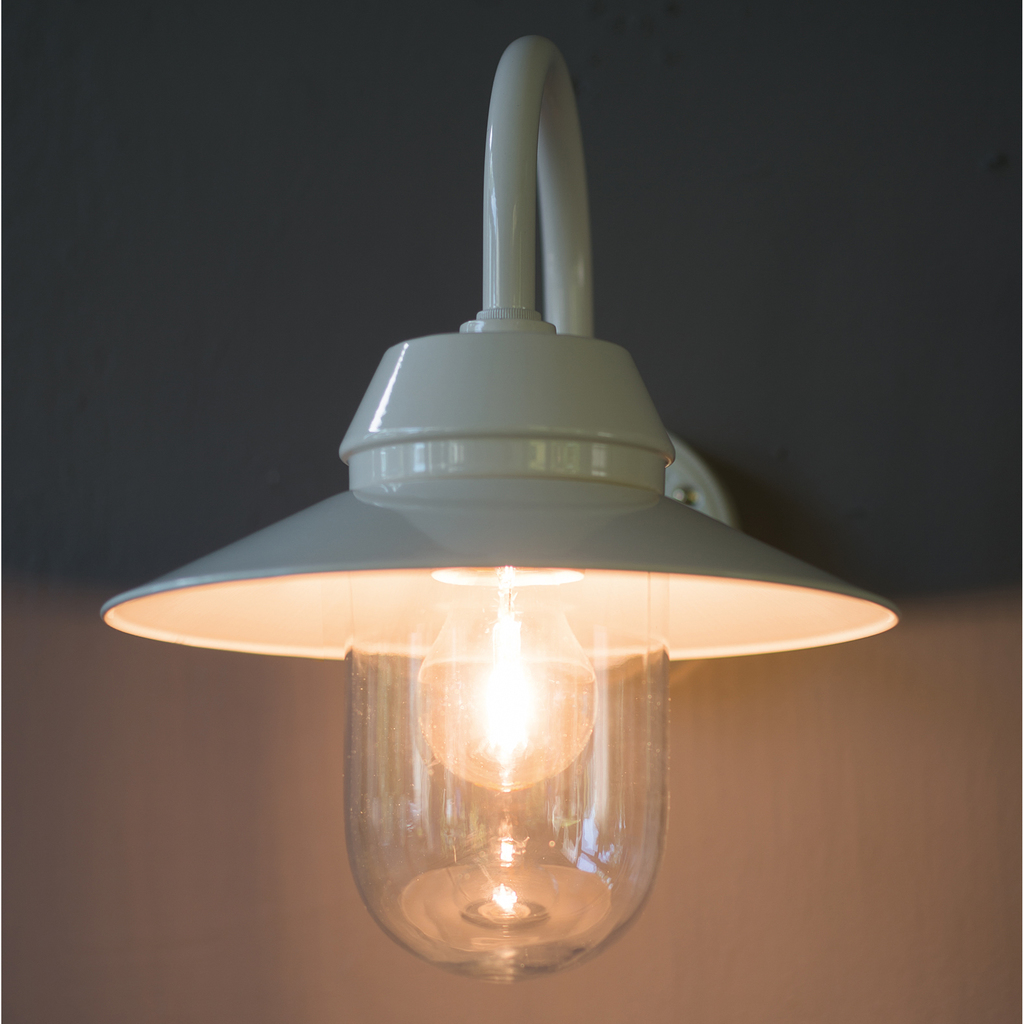 Leuchte zur Wandmontage aus Aluminium, Porzellanfassung, klares Zylinderschraubglas, Befestigung an der Wand mit Rosette aus Aluguß (Lieferung inkl. Dichtplatte). Reflektor mit 25 cm Durchmesser. Aufgrund des rostsicheren Materials und der Ausführung zur Verwendung im Freien geeignet (Schutzklasse IP 54). Diese Leuchte ist geeignet für Leuchtmittel E27 mit max. 60 W.