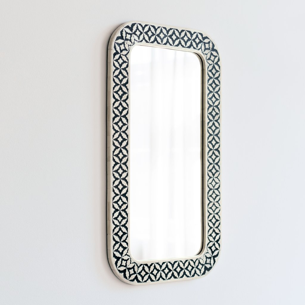 Das kontrastreiche geometrische Muster dieses Holzspiegels entsteht in aufwendiger „Bone and Resin“-Einlegearbeit, einer alten indischen Handwerkstechnik. Hierbei wird ein Muster aus kleinen weißen Knochen-, Muschelschalen- oder Perlmuttstücken mit einem schwarzen Harz ausgegossen, geschliffen und gewachst.
