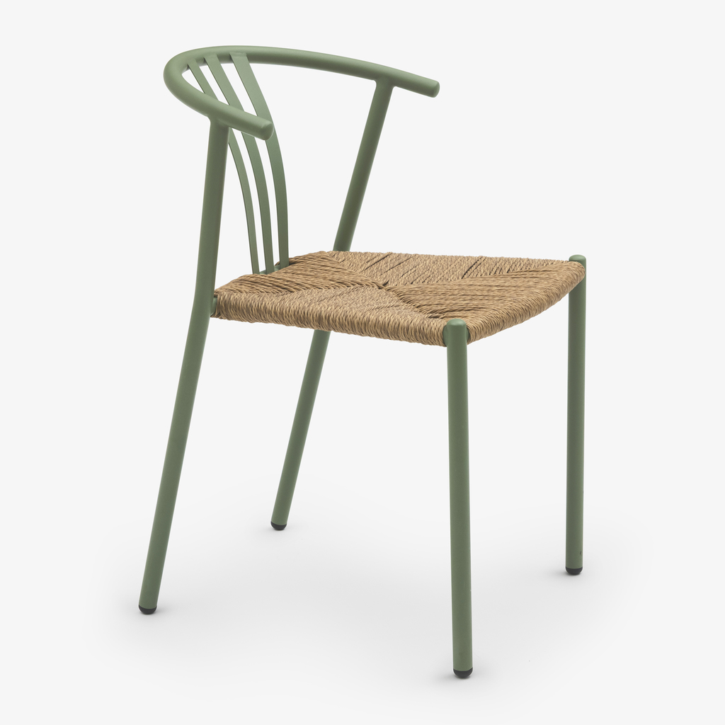In dieser Interpretation wird die klassische Formgebung konsequent für den Außenbereich übersetzt. Das Gestell aus pulverbeschichtetem Metall – erhältlich in dezentem Salbei und einem ruhigen Grau – ist witterungsbeständig und leicht. Die Sitzfläche besteht aus einem robusten, naturfarbenen Polyrattan-Geflecht, das im traditionellen Kuvert-Muster gearbeitet ist.