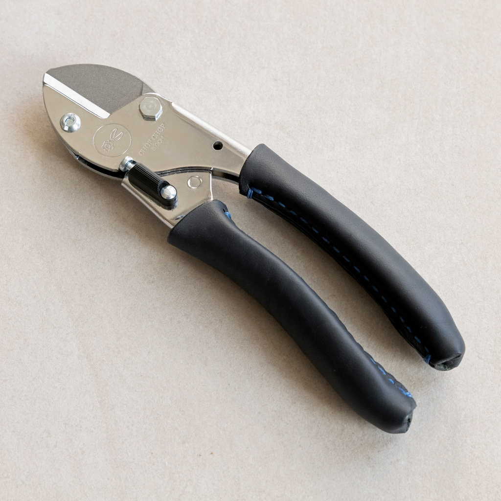 Handliche, aber starke Schere für das Schneiden von Blumen und insbesondere das Nachschneidearbeiten und Arrangieren von Sträußen. Es handelt sich um eine leichtgängige, handgelenkschonende Amboss-Schere mit Hochleistungsfeder aus rostfreiem Stahl, die sehr exaktes Arbeiten auf engem Raum ermöglicht. Besonders schön gemacht sind die handgenähten Griffe aus pflanzlich gegerbtem Kalbsleder – die Schere liegt dadurch ganz anders in der Hand als Scheren mit zwar robustem, aber oft wenig ansehnlichem Kunststoffgriff. Die eigentliche Klinge ist zusätzlich mit einer grauen Beschichtung versehen, die ein Haftenbleiben von Pflanzenresten und damit ein unsauberes Schnittbild verhindert. Für Rechts- und Linkshänder geeignet und speziell auf kleinere Hände ausgerichtet. Vollständig in Deutschland hergestellt. Für Zweige bis zu einer Dicke von 16 mm. Die Ledergriffe werden durch den Kontakt mit den Händen rasch Patina ansetzen.