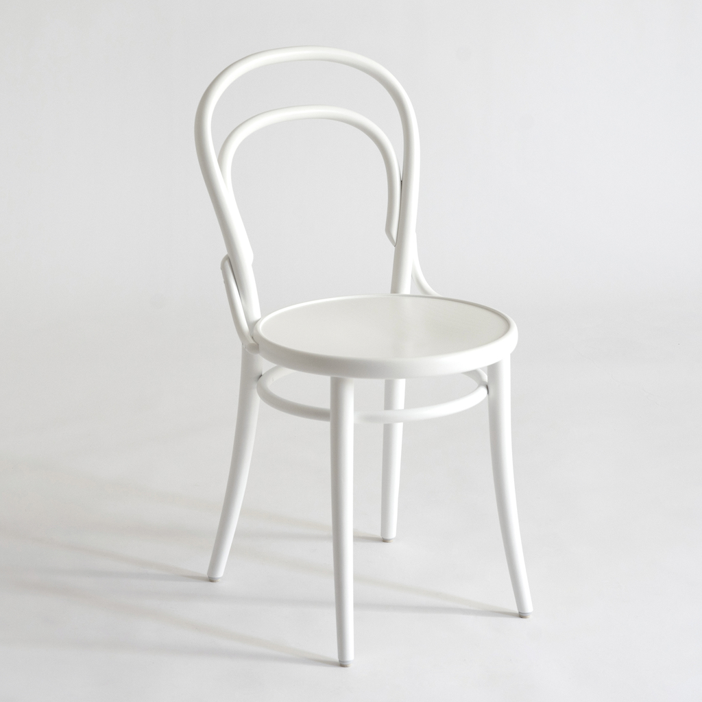 Diesen Stuhl aus dampfgebogenem Buchenholz kennt man seit über eineinhalb Jahrhunderten als Bistro-Stuhl aus Cafés, Bars, Bistros und Restaurants auf der ganzen Welt. Als sein Ursprungsmodell 1859 erstmals angeboten wurde, handelte es sich um das erste auf industrielle Massenproduktion und weltweiten Versand ausgerichtete Möbelstück überhaupt. Die Stühle konnten ab Werk bestellt werden, wurden zerlegt buchstäblich in alle Welt verschifft und vor Ort mit wenigen Handgriffen zu einem leichten, aber mühelos die Jahrzehnte überdauernden Gebrauchsmöbelstück zusammengesetzt. Unsere Version stammt aus der ehemaligen Thonet-Fabrik in Bistritz am Hostein im Osten Tschechiens und ist damit besonders nah an der ursprünglichen Idee der Bugholzmöbel, da dort auch heute noch einfache, aber belastbare Bugholz-Gebrauchsmöbel für Gastronomie und gewerblichen Bedarf produziert werden. Endmontage mit wenigen Handgriffen. Gestell Buchenholz, Sitzfläche Rattangeflecht.