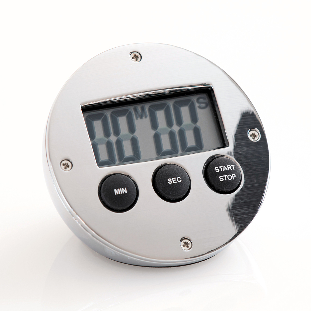 Der Timer zählt eine beliebig einstellbare Zeit von bis zu 99 Minuten herunter. Die zuletzt eingestellte Zeit wird bei der nächsten Benutzung wieder vorgeschlagen. Außerdem gibt es eine Stoppuhrfunktion mit Zwischenzeiten. Eine zum Betrieb erforderliche 1,5 V AAA Batterie ist enthalten. Gehäuse aus poliertem Aluminium. Aus Schweden.