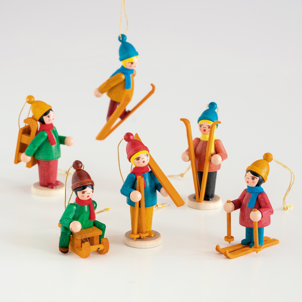 Diese gedrechselten Anhänger stammen aus einem erzgebirgischen Handwerksbetrieb und zeigen Kinder, die mit Skiern und Schlitten ausgerüstet auf dem Weg zum Winterspaß sind. Dass dieses echte erzgebirgische Kunsthandwerk bis heute besteht, ist vor allem der Dregeno zu verdanken, einer Genossenschaft der Drechsler aus Seiffen. 1919 gegründet, bietet die Dregeno über 100 Kunsthandwerksbetrieben aus dem Erzgebirge Vertretung und Vermarktung.