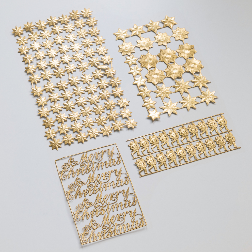 Diese traditionsreichen, plastischen, altgoldfarbenen Ornamente sind seit über 150 Jahren ein Teil sächsischer Papeteriekunst. Derartiger Weihnachtsschmuck wurde traditionell weihnachtlicher Post beigefügt, bis man begann, Weihnachtsgrüße mit Aufklebern zu verzieren. Solche Ornamente werden seit ca. 1870 in Sachsen hergestellt und bestehen aus mehreren Schichten von verleimtem und metallisiertem Karton, der in leicht feuchtem Zustand unter Druck in dreidimensionale Formen gepresst wird. Da die Ornamente nach dem Aushärten ihre in der Presse angenommene Form beibehalten, wirken sie auf frappierende Weise wie aus Metall getriebene oder gepresste Dekorelemente mit Blattvergoldung. Während ihrer Blütezeit in den 1880er und 1890er Jahren wurden Dresdner Pappen von einer Reihe von Herstellern in nahezu unermesslicher Formenvielfalt hergestellt und meist in Heimarbeit endbearbeitet. Besonders beliebt waren auch damals schon Weihnachtsdekoration und Baumschmuck, die dank der im Vergleich zu anderen Materialien günstigen Herstellungskosten für sehr breite Bevölkerungskreise erschwinglich blieben. Unsere Ornamente stammen aus einem Atelier, in dem mit originalen Pressformen aus der Ursprungszeit der Dresdner Pappen gearbeitet wird. Die Ornamente werden bogenweise geprägt und sollten mit einem kleinen, scharfen Messer aus den Bögen herausgetrennt werden. In dem Sortiment, das wir für unsere Kunden zusammengestellt haben, ist jeweils ein Bogen mit Weihnachtssternen, Ordenssternen, Putti und „Merry Christmas“-Schriftzügen enthalten.