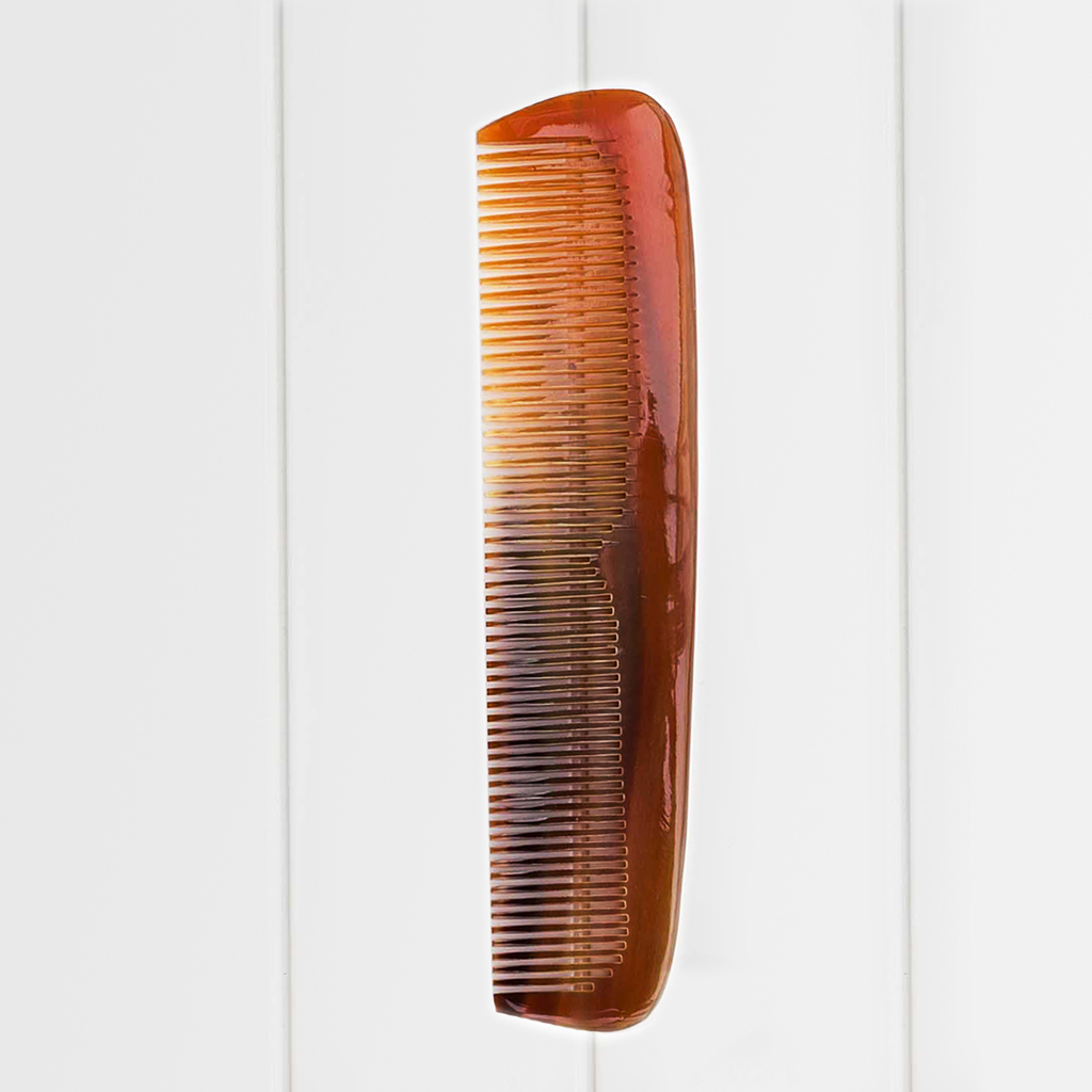 Horn ist das ideale Material für Kämme: Bei richtiger Bearbeitung können daraus Kämme entstehen, die fast wie von selbst durch das Haar gleiten, einen natürlichen Glanz ausstrahlen, bei guter Pflege enorm lange halten und mit der Zeit immer schöner werden. Diese Kämme stammen von einem der letzten Kammacher Deutschlands im mittelfränkischen Hartenstein. Auf teilweise über 100 Jahre alten Maschinen fertigt er ca. 60 Kämme pro Tag, die alle einzeln zugeschnitten werden müssen, von einer frühindustriellen Kammaschine mit Zähnen versehen und abschließend geschliffen und poliert werden. Da es sich bei Horn um ein gewachsenes Naturprodukt handelt, sind auch deutliche Abweichungen in Farbe und Zeichnung möglich – kein Kamm gleicht daher dem anderen.