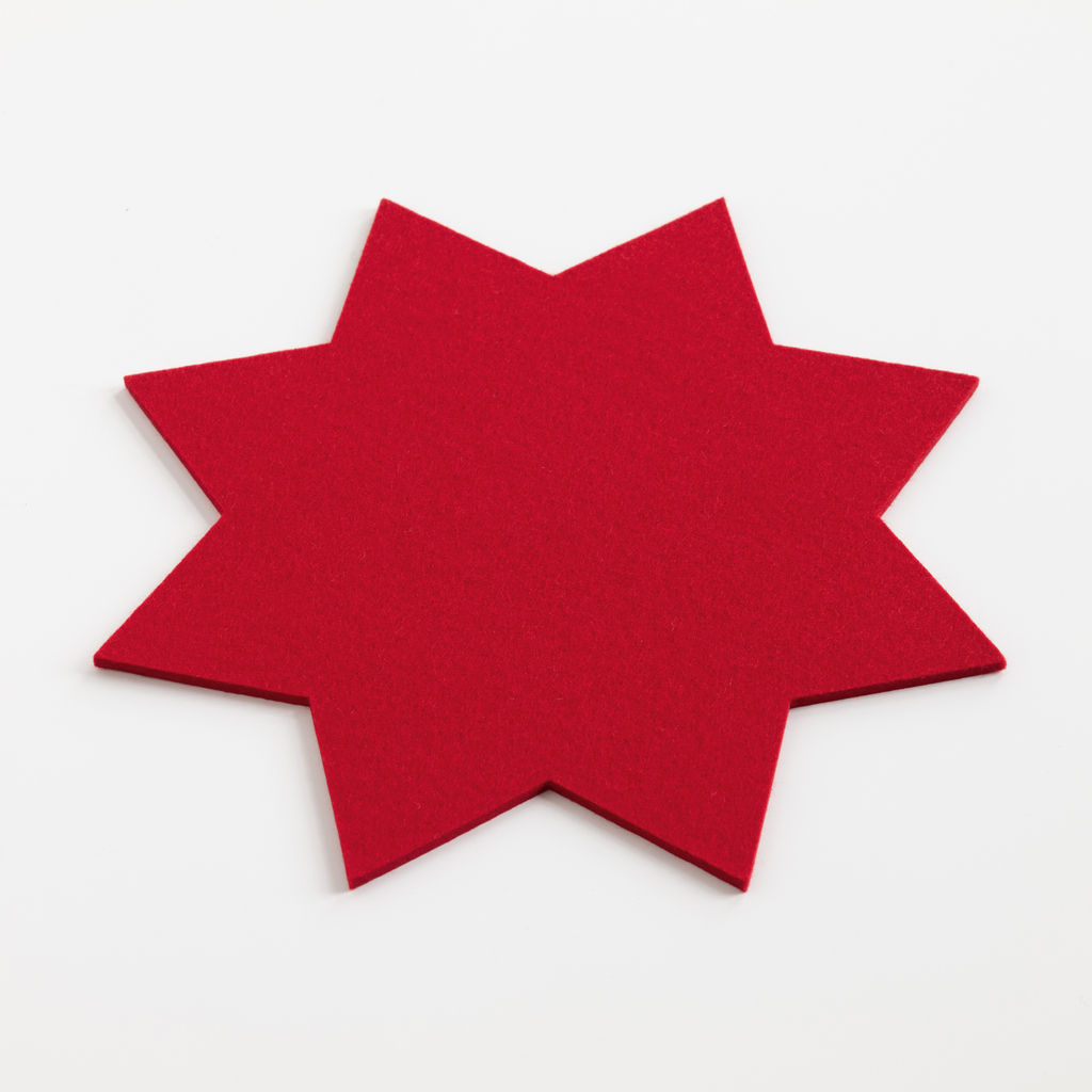 Diese sternförmigen Untersetzer aus reinem, sehr dichtem Wollfilz stammen von einem Betrieb am Niederrhein, der sich auf die Herstellung von Wollfilzprodukten aus reiner Schurwolle spezialisiert hat und diese in einer umfangreichen Farbpalette anbietet. Die Untersetzer isolieren gegen Hitze, saugen Feuchtigkeit auf und sorgen für kippelfreien Stand. Wählen Sie aus den Farben rot, grün und grau. 100 % Wolle.