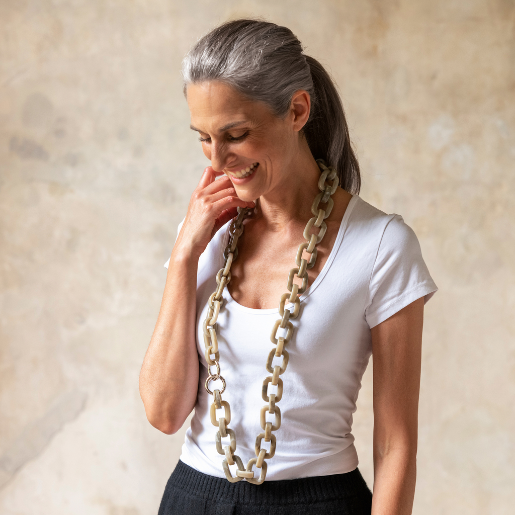 Großgliedrige, auffällige und lange Statement-Kette aus grau und beige marmoriertem, seidig schimmerndem Methacrylat. Silberfarbener Karabinerverschluss. In Italien für das Hamburger Label Tiefenbacher Lehmann gefertigt.
