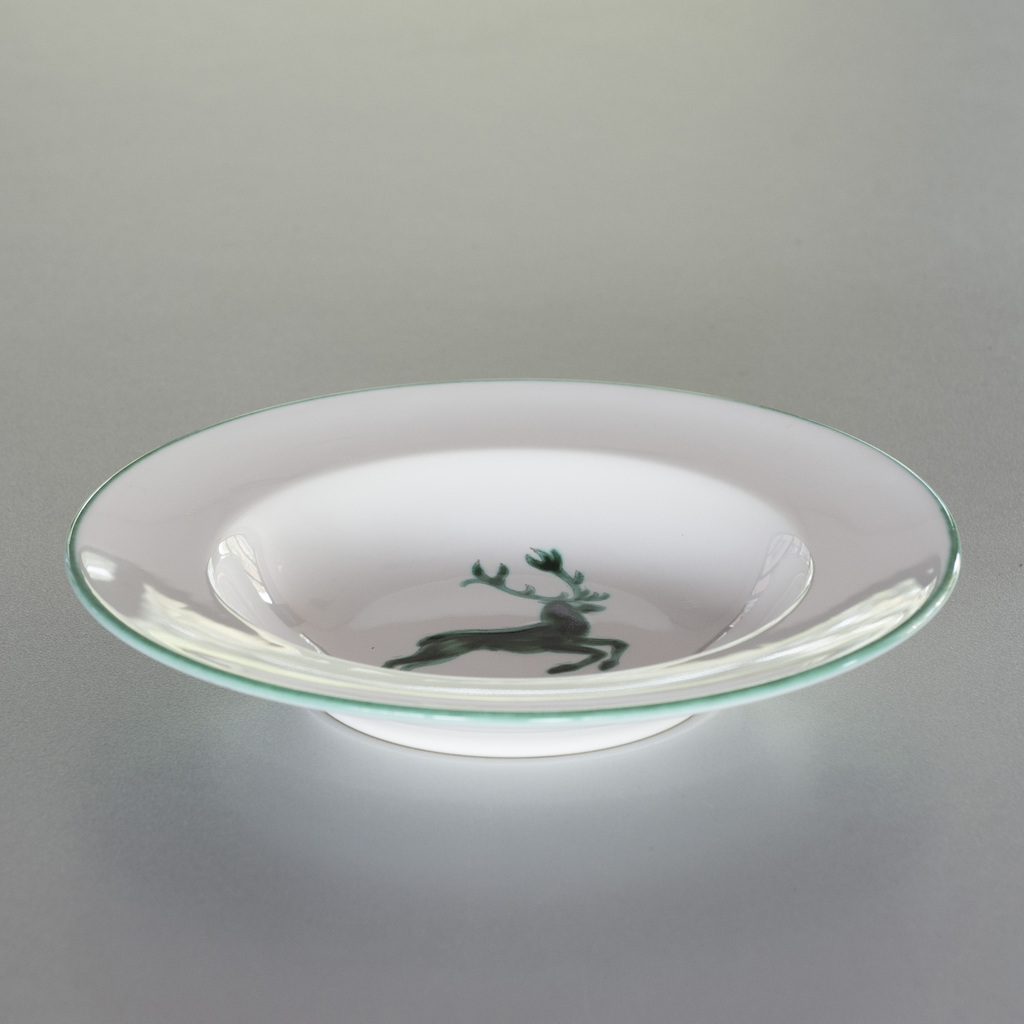 Das Dekor Grüner Hirsch gibt es seit Anfang der 1950er Jahre im Programm der Gmundner Keramik aus Gmunden am Traunsee im Salzkammergut ist ein ländlich-eleganter Klasssiker. Es wurde seinerzeit für das weltberühmte Hotel "Goldener Hirsch" in Salzburg kreiert und später aufgrund großer Nachfrage für den Handel freigegeben. Wir bieten die Teller in der seit 2007 lieferbaren "Gourmet-Form" mit "Fahne" (einem breiten Rand) an. Alle Teile werden aufwendig von Hand bemalt und entstehen auch sonst zu 90% in Handarbeit - vom Töpfern bis zum Brennen. Keramik. Spülmaschinenfest und mikrowellentauglich.
