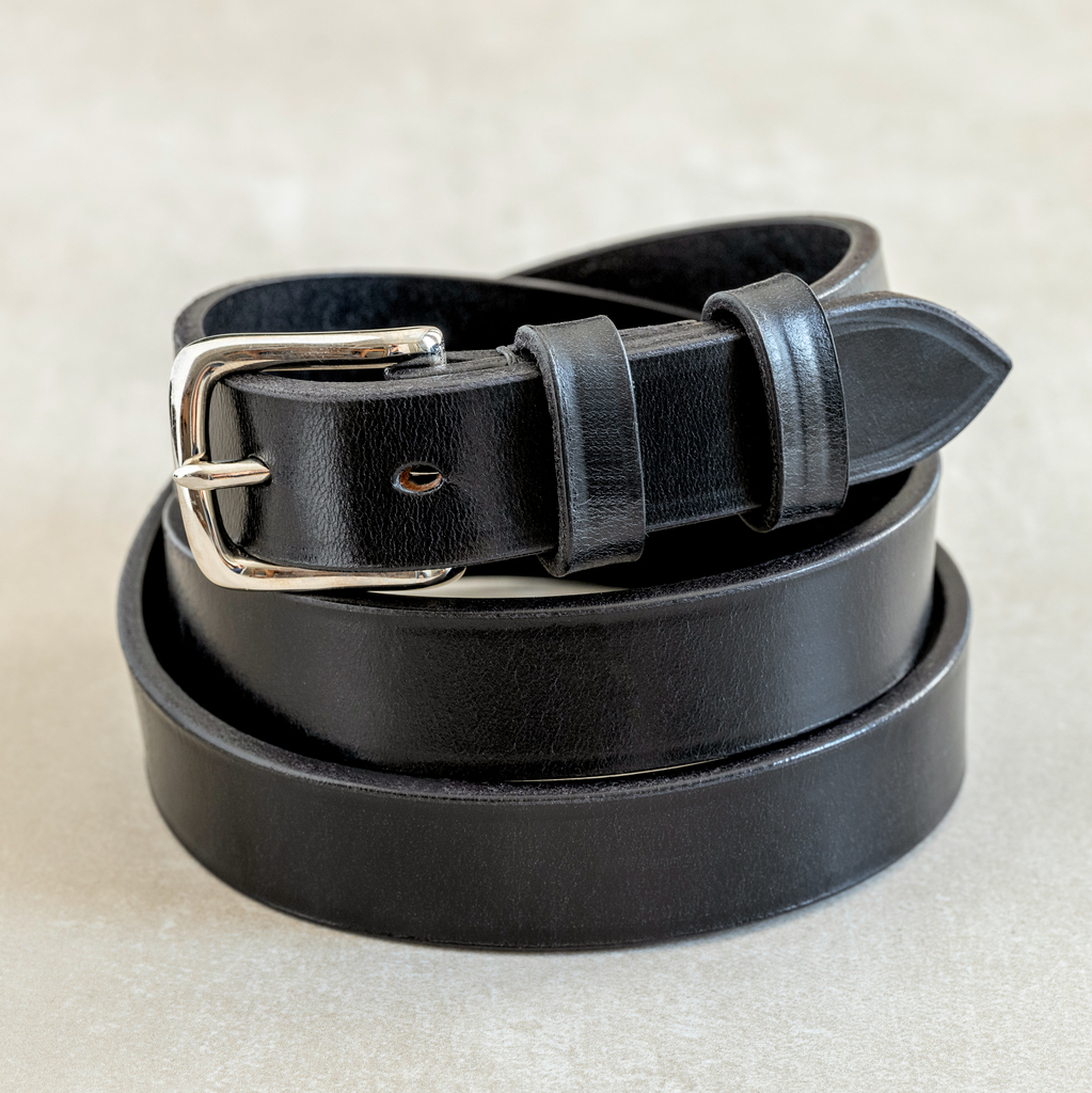 Er wird in einem kleinen lederverarbeitenden Betrieb im englischen Worcestershire aus einem Stück Sattelleder hergestellt. Da man auf diese Weise ohne Futter und Nähte an den Kanten auskommt, ist der Gürtel sehr strapazierfähig und deutlich langlebiger als ein genähter Gürtel. Schnalle aus Messing.