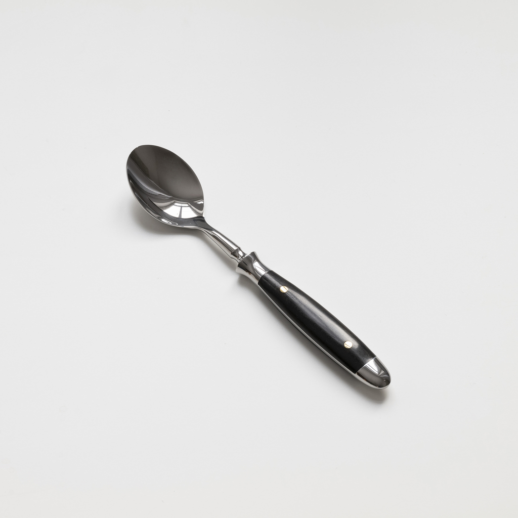 Grundlage für jedes einzelne Teil ist ein Stück rostfreien Chrom- Vanadium-Stahls, das von Hand geschmiedet und anschließend ebenfalls in mühevoller Handarbeit durch Schleifen und Polieren zur Perfektion gebracht wird. Auch von Hand werden die bauchigen Griffschalen aus Holz zugerichtet, die anschließend mit zwei wiederum von Hand gesetzten Messingnieten nahezu nahtlos mit der Verlängerung der Klinge verbunden werden. Die Gabelzinken sind einzeln rundgeschliffen und zugespitzt, um müheloses und schonendes Aufspießen zu ermöglichen, und für die Messerklingen kommt das Verfahren des Blaupließtens zur Anwendung: ausgiebiges Schleifen der Klinge bis zur feinstmöglichen Stufe, an dessen Ende eine extrem glatte Oberfläche mit bläulichem Schimmer entsteht. In der klassischen Ausführung sind die Griffschalen des Eichenlaub-Bestecks aus afrikanischem Ebenholz gefertigt: feinporig, dicht und von dunkler, nahezu schwarzer Farbe mit leichten, bräunlichen Streifen.