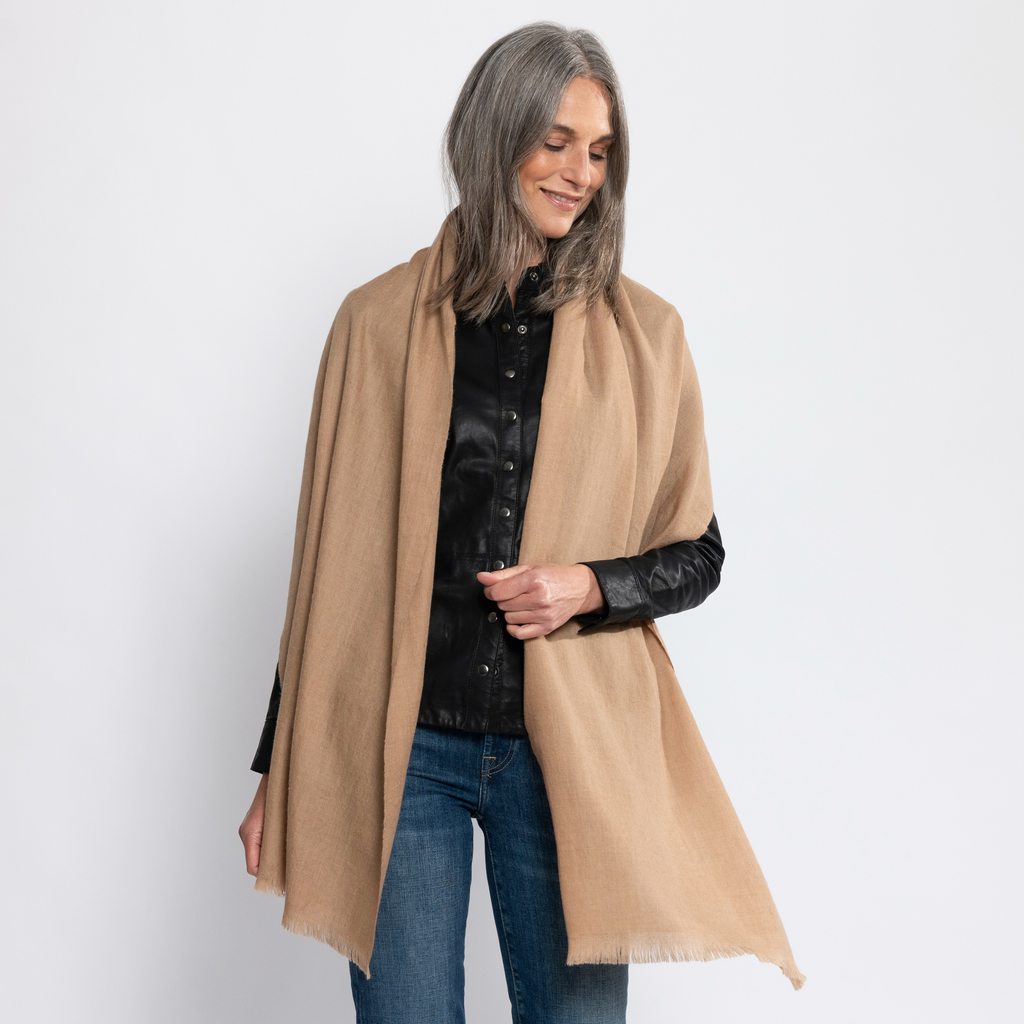 Für diese gänzlich in naturbelassenen Farbtönen gewebten Schals wurden in der Traditionsweberei Kashmir Loom nicht nur Kaschmir verarbeitet, sondern auch hauchdünne Garne aus Yak- und Kamelhaar. Beide gehören wie das Haar der Kaschmirziege zu den Edelhaaren und damit zu den feinsten und weichsten Wollsorten der Welt. Aus ihnen gefertigte Webwaren stehen in Sachen Tragekomfort Kaschmir in nichts nach, sind von luxuriöser Weichheit und Leichtigkeit, temperaturausgleichend und besonders hautfreundlich. Die wenig bekannte Yak-Wolle wird aus dem feinen Unterhaar von langhaarigen, in der Himalaya-Region beheimateten Yak-Rindern durch Auskämmen gewonnen.