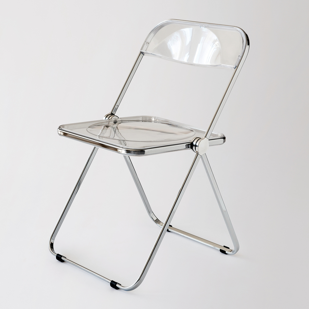 Nicht einfach ein Klappstuhl. Dieser hat Designgeschichte geschrieben. Der berühmte Plia-Stuhl wurde 1968 vom Italiener Giancarlo Piretti entworfen. Kein Wunder also, dass selbst in der Ferrari-Boxengasse die Techniker auf diesem Stuhl beim Rennen mitfiebern. Heute findet man den Plia im Museum of Modern Art in New York. Er besteht aus verchromtem Röhrenstahl und transparentem, glasklaren zellulosebasiertem Kunststoff. Das Monogelenk aus Leichtmetall-Druckguss ist poliert. Das Besondere an diesem auf den ersten Blick schlichten Klappstuhls ist das patentierte Verfahren, mit welchem sich die Stühle zusammenklappen lassen. In einer Linie können die Stühle platzsparend in einer Ecke zusammengestellt werden. Als Solitair oder "große Lösung" für den Esstisch.
