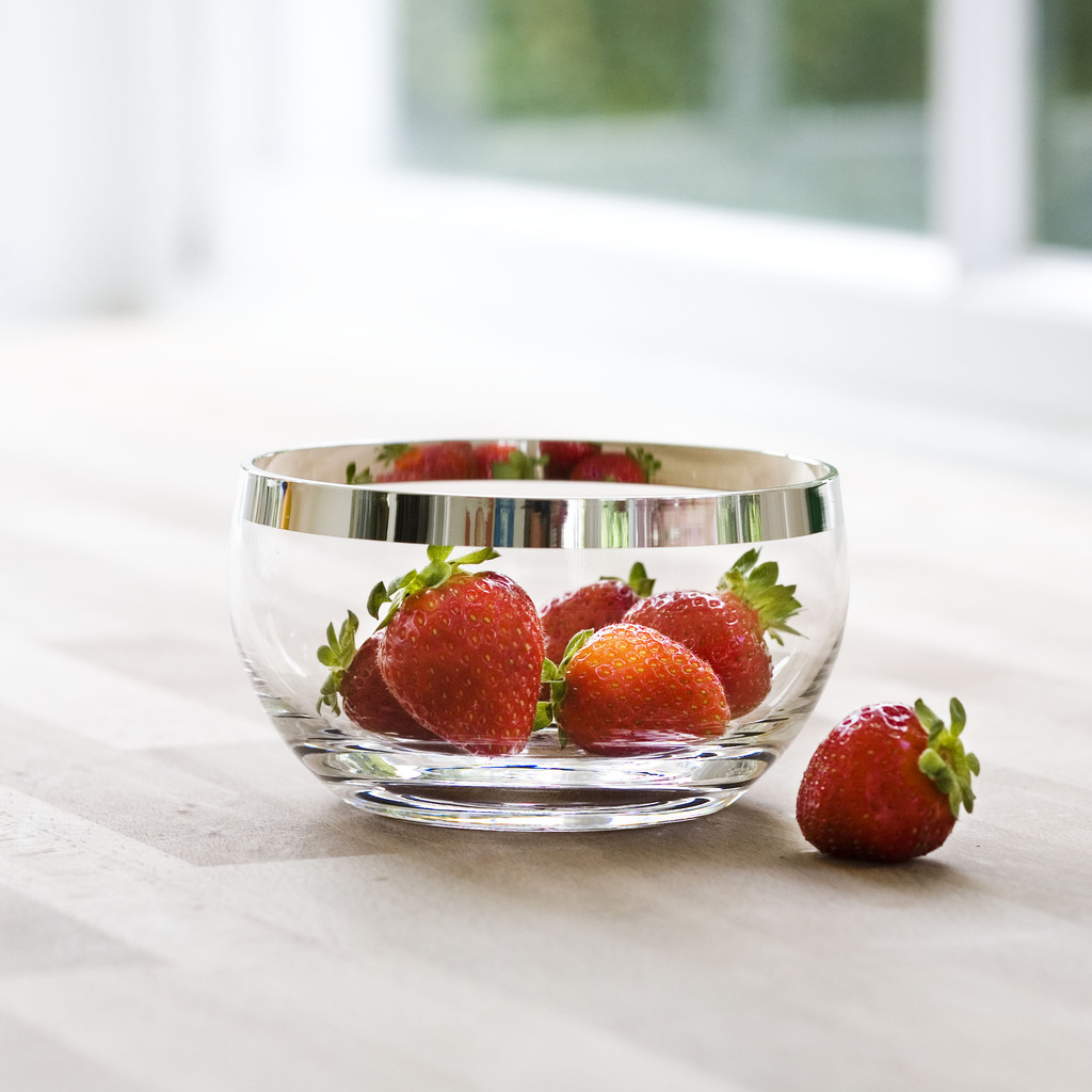 Der Rand dieser Schale aus mungeblasenem Kristallglas wird im Wege der galvanischen Veredelung mit einer Feinsilber Auflage versehen (1000/000). Die Silberschicht ist deutlich stärker als bei herkömmlicher versilberter Ware. Sie kann wie jeder andere Silbergegenstand gepflegt werden. Das Glas ist mundgeblasen.