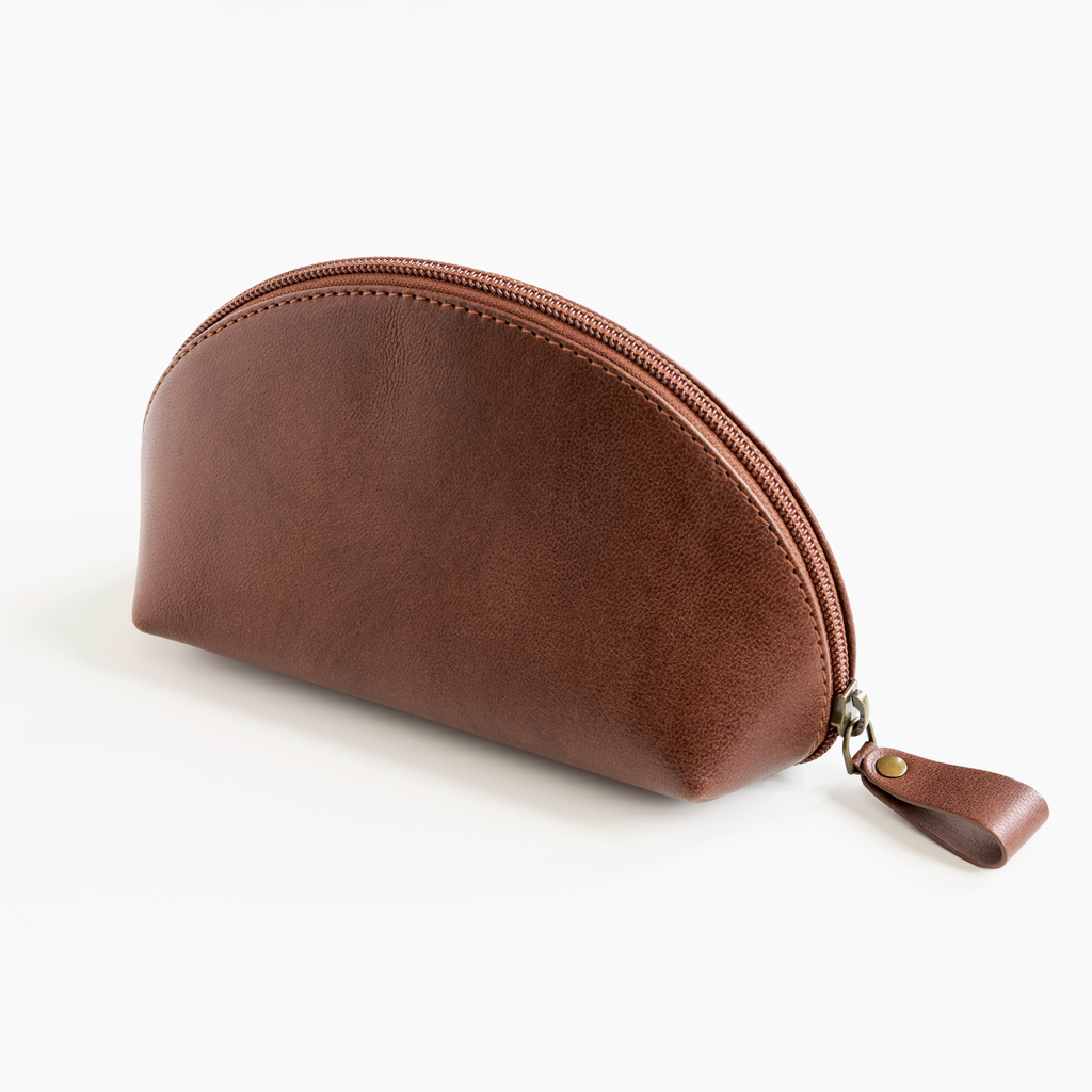Die halbmondförmige Kulturtasche Luna sorgt dafür, dass die wichtigsten Kosmetika oder persönlichen Essentials immer griffbereit sind – ob in der Handtasche oder im Reisegepäck. Für maximale Übersicht und leichten Zugriff lässt sich die erstaunlich geräumige Halbmondform über die gesamte Rundung mit dem Reißverschluss öffnen – dank ihres flachen Bodens bleibt sie dabei immer standfest. Das rotbraune Rindsleder ist unbehandelt und entwickelt mit der Zeit eine individuelle Patina. Innen Satinfutter mit kleinem Steckfach. 18 x 10 cm.