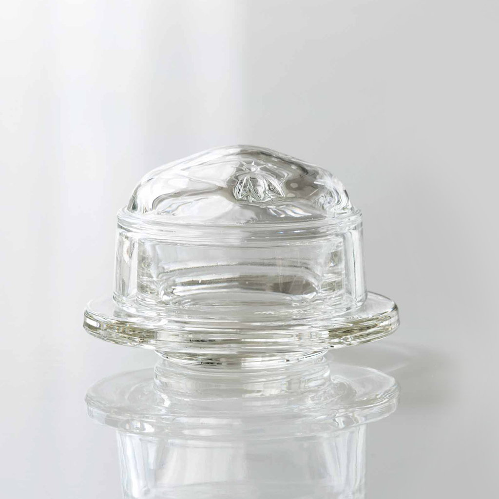 Kleines Schälchen mit Glocke für Marmelade, Butter oder Honig. Auch kleine runde Weichkäse lassen sich unter dieser Glocke gut präsentieren. Von La Rochère in Frankreich, geschmückt mit der Biene, dem Wappentier der Familie Bonaparte.