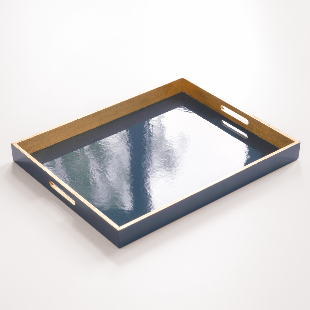 Hochglänzend lackierte, leichte Holztabletts in kräftiger Farbgebung, reizvoll gerahmt von einem matt schimmernden, handwerklich aufgebrachten Goldrand. Durch einen aufwendig in vielen Schichten aufgetragenen Klarlack erhalten die Farben eine besondere Tiefe und das Tablett die volle Gebrauchsfähigkeit. Der mit Velours bezogene Boden schützt empfindliche Untergründe. Griffe an den Schmalseiten.