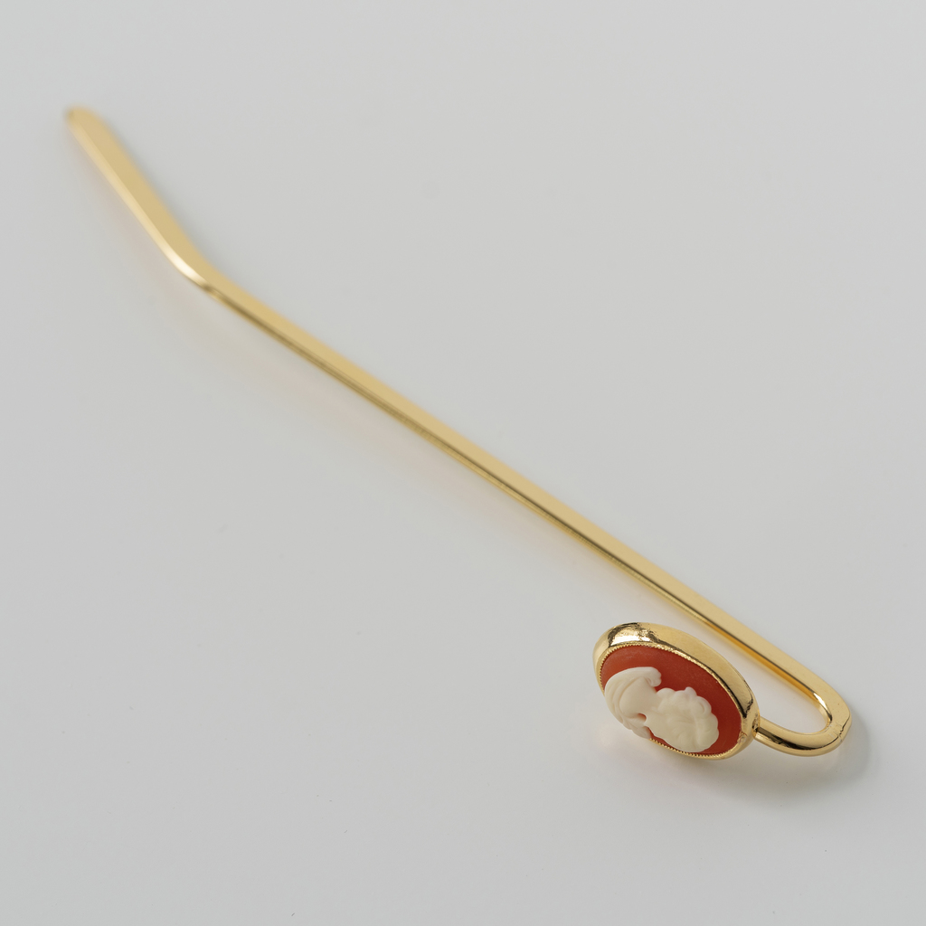 Eine kleine Werkstatt in Paris stellt Broschen und diese Lesezeichen aus Metall nach historischen Vorbildern her. Die Einzelteile werden aus Messing gegossen, entgratet und poliert, mit Zinn verlötet, anschließend vergoldet und patiniert.