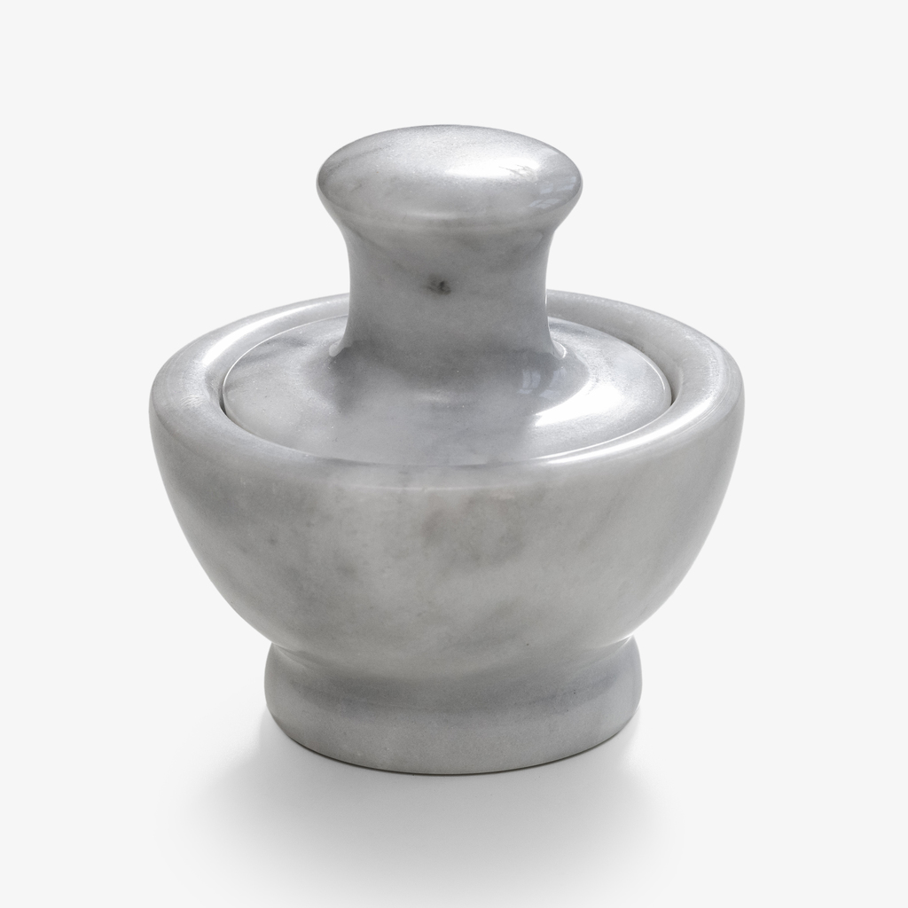 Dieser kompakte Mörser aus massivem Marmor ist auf maximale Effizienz ausgelegt. Sein Pistill ist so voluminös und passgenau gestaltet, dass er die innere Rundung der Schale nahezu formschlüssig ausfüllt. Diese durchdachte Proportion maximiert die Mahlfläche und macht ihn zum idealen Werkzeug, um kleine, harte Gewürze wie Pfeffer- oder Pimentkörner mit wenig Aufwand fein zu zermahlen. Die polierte Oberfläche des Steins liegt kühl und schwer in der Hand, während sein hohes Eigengewicht für einen sicheren Stand beim Arbeiten sorgt.