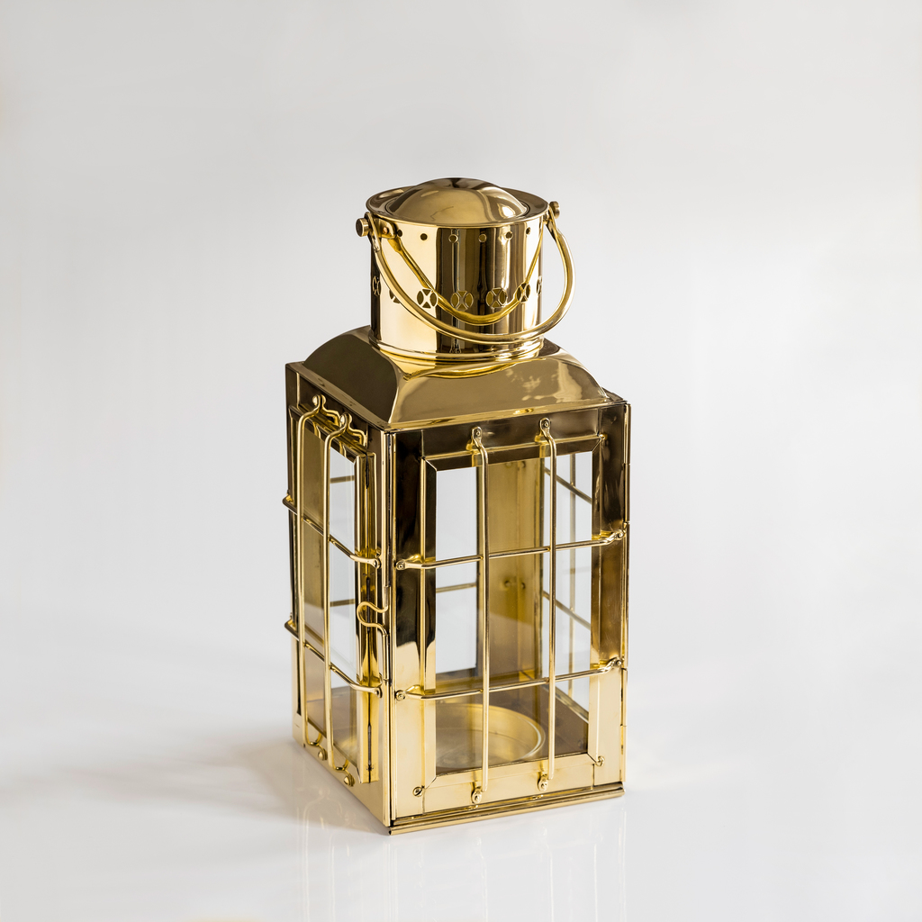 Eine alte Eisenbahnlaterne stand Modell für unsere dekorative Laterne aus hochglanzpoliertem Messing. Wie bei ihrem Vorbild sind die Glasfenster durch Gitterstäbe vor Beschädigung geschützt. Eine Seite lässt sich öffnen, im Inneren nimmt ein herausnehmbarer Glaseinsatz eine Stumpenkerze mit einem Durchmesser von bis zu 10 cm auf. Das unbehandelte Messing setzt mit der Zeit eine typische Patina an. Mit beweglichem Henkel.