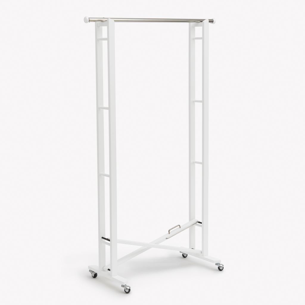 Wieder erhältlich: Nachdem unser früherer Hersteller das Modell aus dem Sortiment genommen hatte, legen wir diesen Kleiderständer mit seiner cleveren Faltmechanik nun selbst neu auf. Mit nur zwei Handgriffen verwandelt er sich: Einfach die Kreuzverstrebung am Griff auseinander- oder zusammenschieben und die Garderobenstange ein- oder aushängen. Gefertigt aus massivem Buchenholz, überzeugt die stabile Garderobe nicht nur als flexible Lösung bei vielen Gästen, sondern auch im Dauereinsatz. Zusammengeklappt misst sie lediglich 11 cm in der Breite und lässt sich bequem verstauen. Mit leichtlaufenden, kugelgelagerten Rollen. Garderobenstange aus poliertem Edelstahl, Länge 105 cm. Lässt sich in wenigen Schritten zusammenbauen.