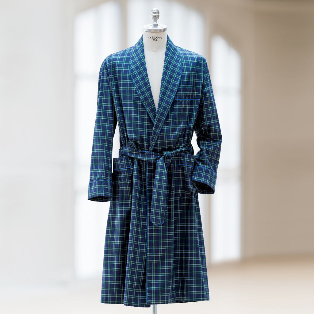 Mit seinem weichen, sehr flauschigen Baumwollflanell ist dieser Morgenmantel eher für die kälteren Jahreszeiten geeignet. Man macht in ihm immer eine gute Figur, wenn man direkt vom Bett an die Haustür muss, und es ist herrlich, in so einem Morgenmantel zu frühstücken oder bei einem ersten Kaffee die Zeitung zu lesen und sich erst danach mit den Anforderungen des Tages zu befassen. Mit blau abgesetzten Paspeln. Ohne Futter, mit Schalkragen, Gürtel und zwei Einschubtaschen. Der Stoff stammt aus Italien.