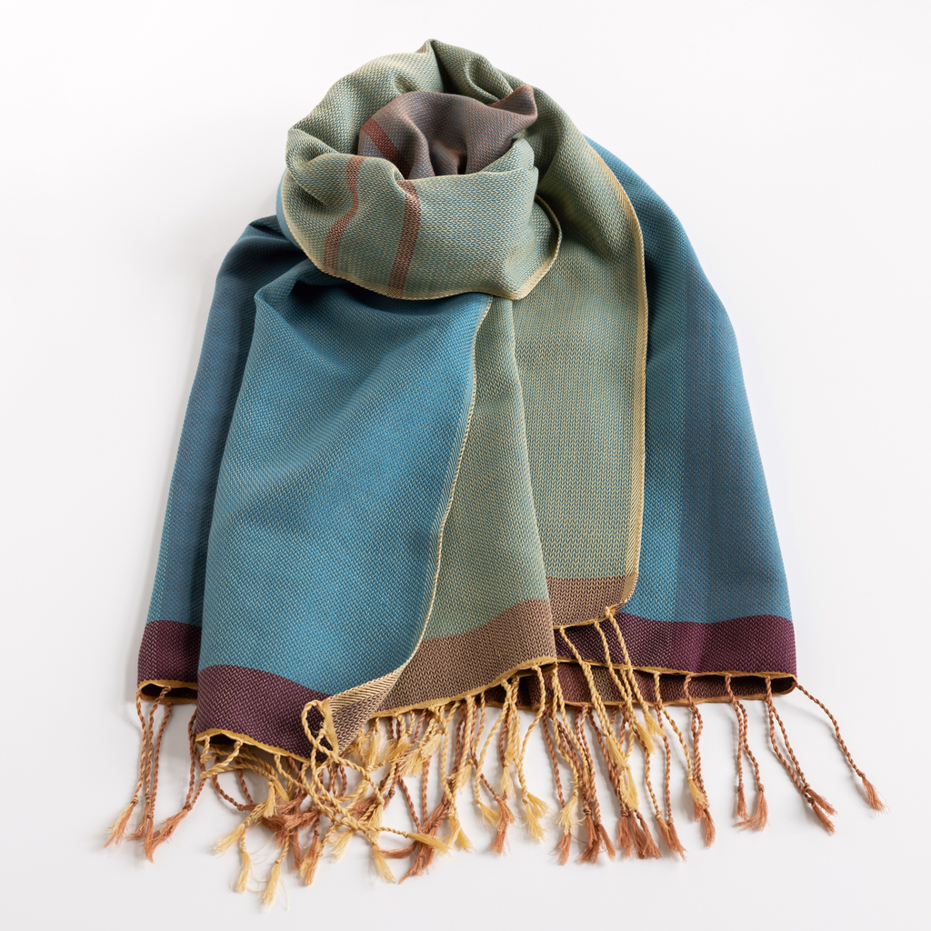 Die Tücher tragen sich angenehm auf der Haut, sind ein ideales, weil unkompliziertes Accessoire, das wärmt und gleichzeitig ein modisches Statement ist. Lange, zu Kordeln gedrehte Fransen schließen die Schmalseiten ab, eine stabile Webkante die Längsseiten.