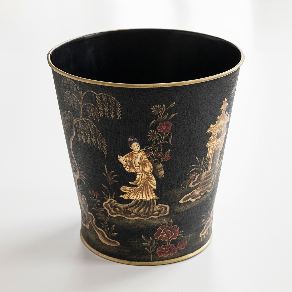 Mit umlaufendem Chinoiserie-Dekor. Im Gegensatz zu den an-deren beiden anderen Körben sorgt das pastos aufkaschierte Dekor hier für einen stärker ausgeprägten Struktureffekt, wie man ihn von gealtertem Firnis kennt.