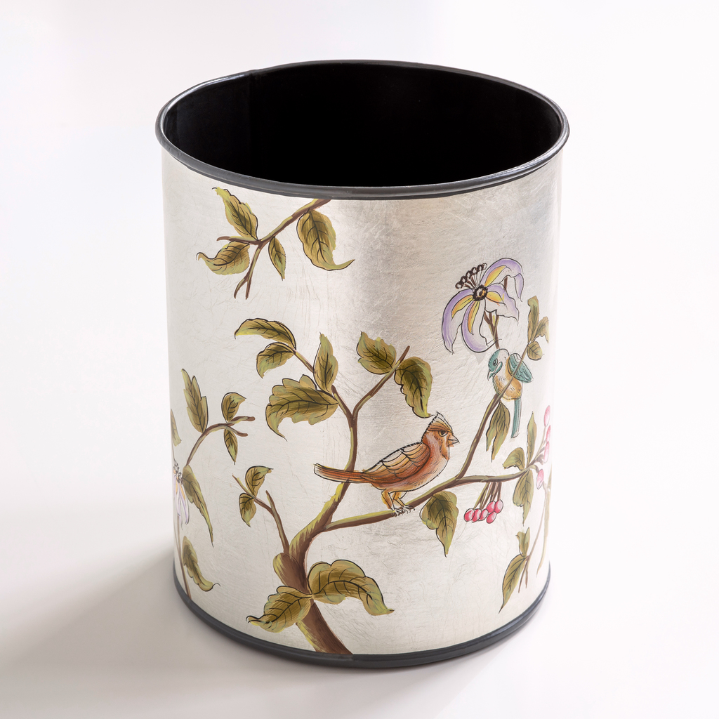 Kleine, sehr aufwändig handbemalte Accessoire-Serie für Badezimmer und Schlafzimmer, die in einem aufwändigen Mehrschichtverfahren mit japanisch inspiriertem Dekor versehen ist. Eine silberne Grundierung mit Schrumpflack sorgt für einen ausgeprägten optischen Vintage-Struktureffekt.