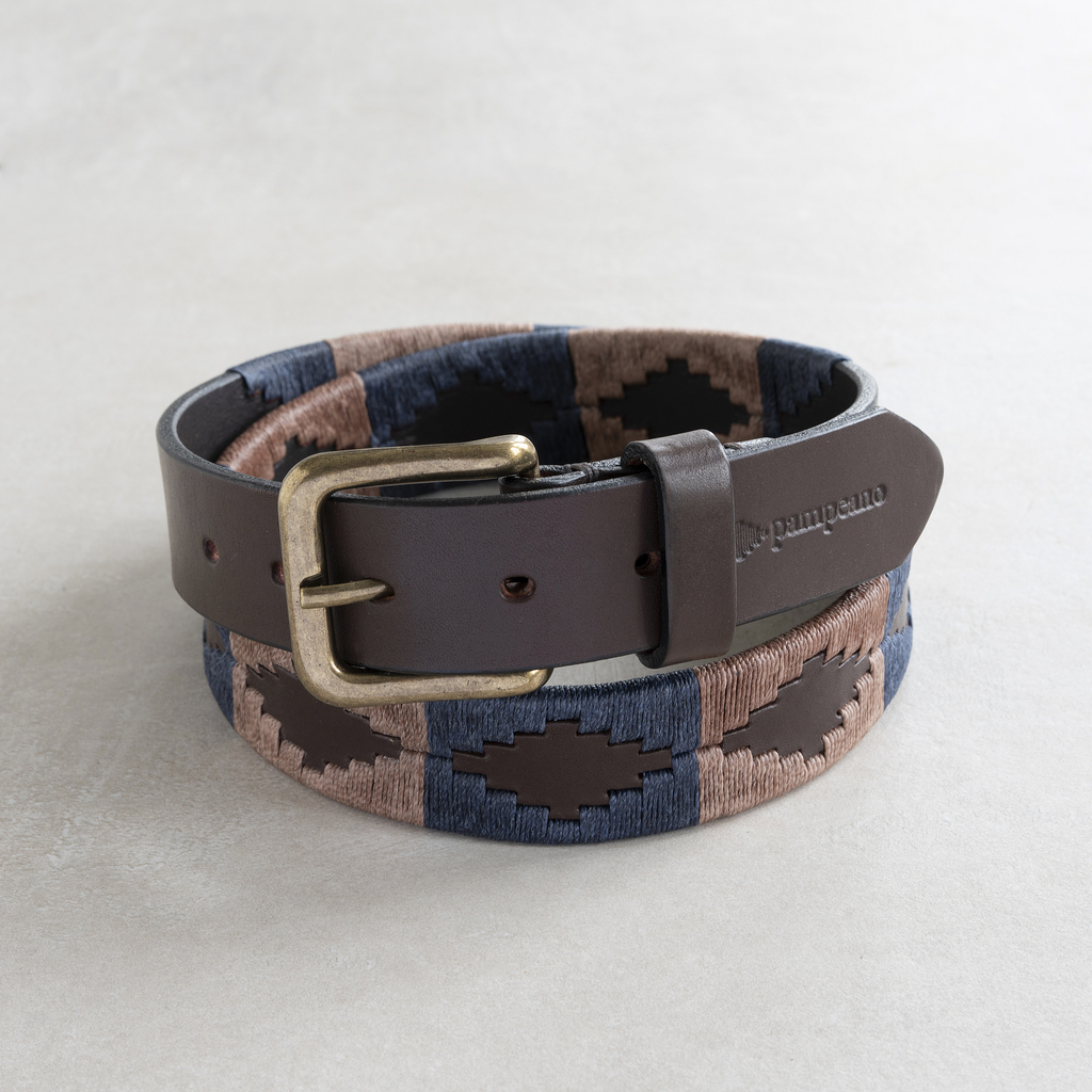 Argentinische Polo-Gürtel aus pflanzlich gegerbtem, butterweichem Rindsleder. Das typische Muster entsteht in reiner Handarbeit: Mittels einer Schablone werden zunächst Schlitze in die Gürtel gestochen und dann von Hand mit dickem, gewachstem Sattlergarn zu perfekten geometrischen Mustern verfüllt. Schließe aus massivem Messing. Breite 3,5cm. Lieferbare Längen von 80 bis 115cm in Schritten von 5cm. Grundfarbe Braun, lieferbare Muster in Braun/Navy, Hellblau/Weiß/Navy oder Hellblau/Weiß/Grün/Rot.