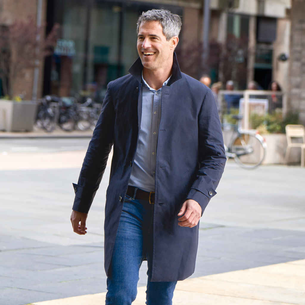 Kurzer, einreihiger Mantel für die Übergangszeit: Als Obermaterial kommt ein mit 280 g/m² eher leichtes, dafür aber wasserfest gewachstes Gewebe aus reiner Baumwolle zum Einsatz, das im Gegensatz zu traditionellem Wachstuch einen sehr trockenen Griff hat und daher auch kein Wachs z. B. an den Autositz abgibt. Ein leichtes, wattiertes Innenfutter sorgt für die nötige Wärme – der Mantel ist hier einem normalen Trenchcoat deutlich überlegen. Die Länge ist so bemessen, dass der Mantel mühelos ein darunter getragenes Sakko um zwei, drei Handbreit überdeckt. Trotzdem ist er kurz genug, um im Auto den eigenen Bewegungsspielraum nicht einzuengen – man muss also nach dem Einsteigen nicht erst viele Stofflagen sortieren. Breiter Kragen, drei Knöpfe, Rückenschlitz, Ärmel mit Manschetten. Zwei seitliche Einschubtaschen, drei Innentaschen. Royalblaues Innenfutter aus 100 % Viskose.