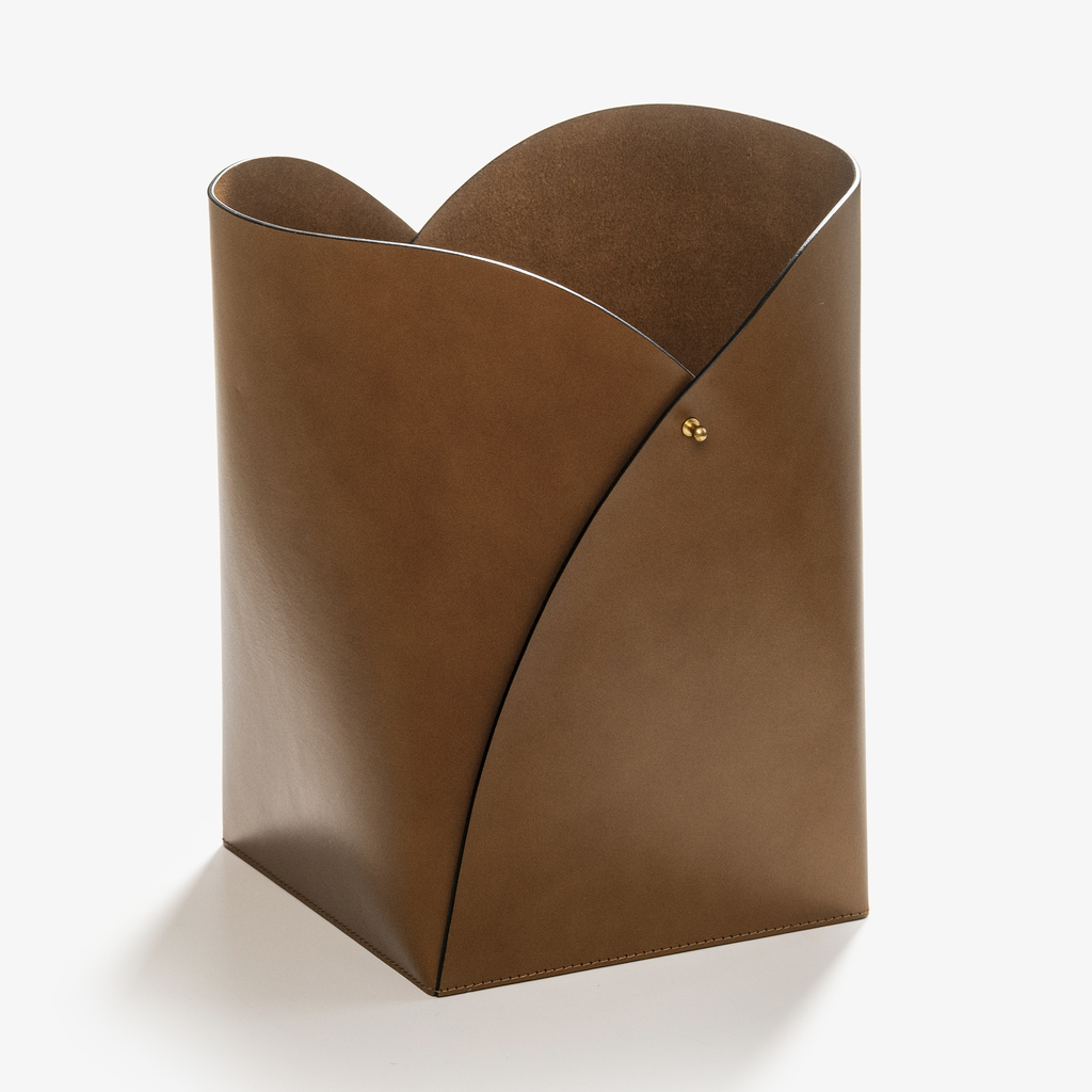 Eine klare Formensprache und eine durchdachte Konstruktion zeichnen diesen Papierkorb aus. Aus kräftigem Büffelleder gefertigt, entwickelt sich der Korpus von einer quadratischen, standfesten Basis zu einer weich gerundeten Öffnung. Die überlappende Fügung der einzelnen Lederbahnen wird durch zwei messingfarbene Nieten gesichert.