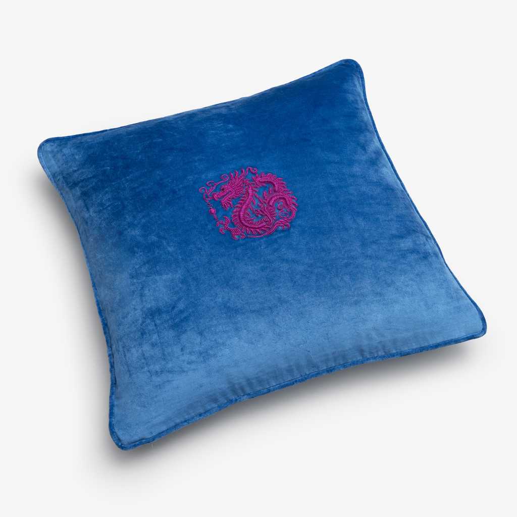 Im Zentrum dieser Samtkissen steht ein kunstvoll in Zardozistickerei gearbeiteter Drache. In einer besonders dichten und detailreichen Technik von Hand gearbeitet, hebt sich das Motiv in leuchtendem Pink leicht plastisch von der samtigen Oberfläche ab. „Zari Zardozi“, das „Sticken mit Goldfäden“, ist eine jahrhundertealte indische, sehr aufwendige Sticktechnik mit Metallfäden, Perlen und Draht. Ihren Ursprung hat sie in Persien und war ursprünglich dem Verzieren königlicher Gewänder vorbehalten. Nur wenige Werkstätten in Indien halten die Tradition dieser Handwerkskunst noch aufrecht. Umlaufender Keder, inkl. Füllung.