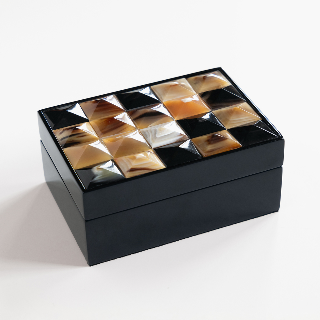 Der Deckel dieser tiefschwarz glänzenden Holzschatulle wird von einem opulenten Mosaik aus 20 kleinen Pyramiden geschmückt. Gefertigt aus echtem Horn, zeigen sie dessen gesamte natürliche Farbpalette von Beige über Braun bis hin zu Schwarz. Jedes Hornmosaik ist ein Unikat, da die Farbnuancen des Naturmaterials und ihre Zusammenstellung variieren. Das Innere sowie der Boden sind mit schwarzem Wildleder ausgestattet. Der Klappdeckel ist mit Messingscharnieren versehen.
