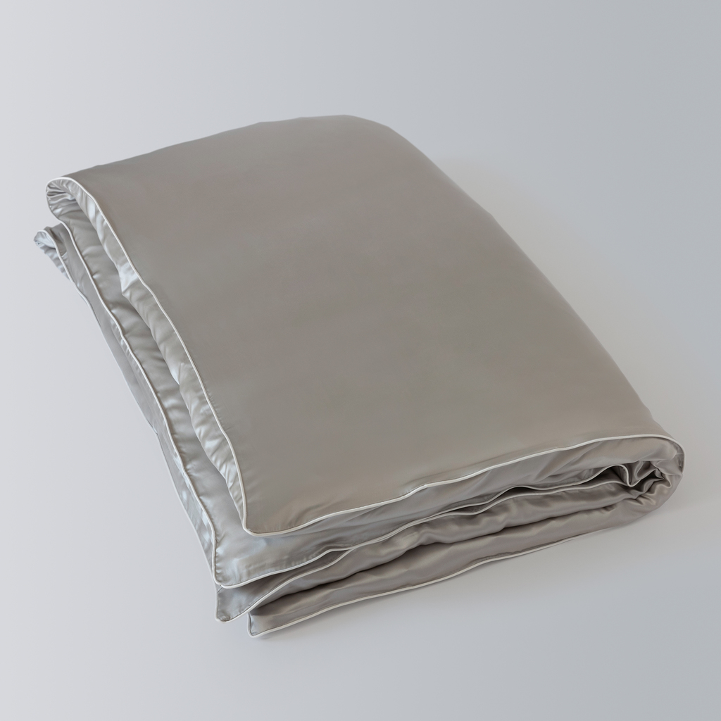 Für diese silbergraue Bettwäsche wird reine Maulbeerseide zu echtem Seidensatin verarbeitet. Auch wenn man bei der leichten, weich fließenden Seide nicht als Erstes an ihre Eignung als Bettwäsche denkt, hat sie einige Qualitäten für guten Schlafkomfort zu bieten: Seide gilt als besonders haut- und haarfreundlich, da ihre glatte und antistatische Oberfläche nur wenig Reibung erzeugt. Sie wehrt Hausstaubmilben ab, ist antibakteriell und fühlt sich aufgrund ihrer temperaturregulierenden Eigenschaft bei warmem Wetter kühl und bei kaltem Wetter warm an. Fein und fließend im Griff schmiegt sich das feine Material besonders sanft an den Körper. Alle Kissen- und Bettbezüge sind mit einer umlaufenden Paspel aus ägyptischer Baumwolle verstärkt, die dem weichen Seidengewebe die nötige Stabilität verleiht.
