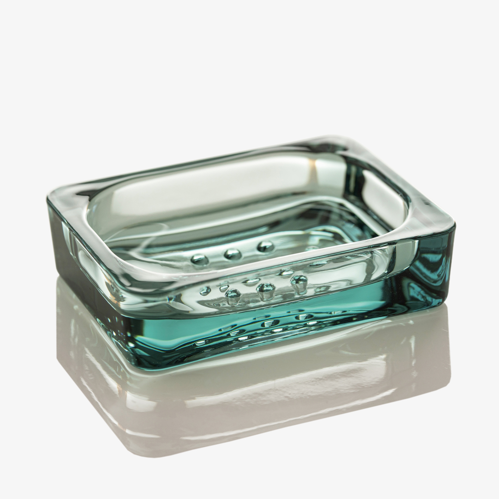 Aus massivem, durchgefärbtem Glas in einem sanften Türkiston gefertigt, zeigt diese Seifenschale eine klare, quadratische Grundform mit weich abgerundeten Kanten. Das funktionale Detail liegt im Inneren: Mehrere erhöhte Auflagepunkte lassen das Seifenstück leicht erhöht liegen, sodass stehendes Wasser die Seife nicht aufweicht. Spülmaschinenfest.