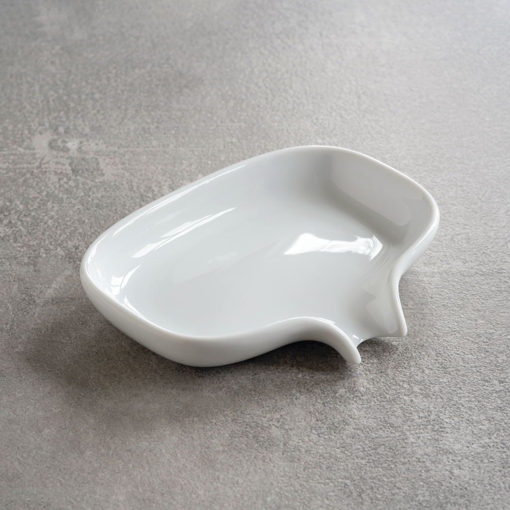 Durchdachte Seifenschale zur Verwendung direkt am Beckenrand. Die eigentliche Schale ist mittig leicht erhaben, sodass feuchte Seifenstücke niemals flächig aufliegen und daher nicht durchweichen. Die Schale wird ohne Seife geliefert.