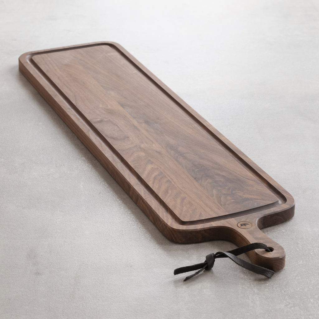 Außergewöhnlich schöne Servierbretter aus rötlich bis dunkelbraun gemasertem Walnussholz, das sich dank seiner guten Säurefestigkeit hervorragend zum Servieren von kalten Speisen eignet – zusätzlich sind die Bretter mit geruchs- und geschmacksfreiem Traubenkernöl behandelt. Walnussbäume werden trotz der ansprechenden Struktur, der Zähigkeit und der guten Verarbeitungseigenschaften ihres Holzes fast ausschließlich zur Nussgewinnung angebaut und nur dann gefällt, wenn sie nicht mehr tragen. Das seltene Holz wird meist nur als Furnier verwendet – entsprechend ungewöhnlich und wertvoll sind Werkstücke aus Vollholz. Mit Griff und Band zum Aufhängen.