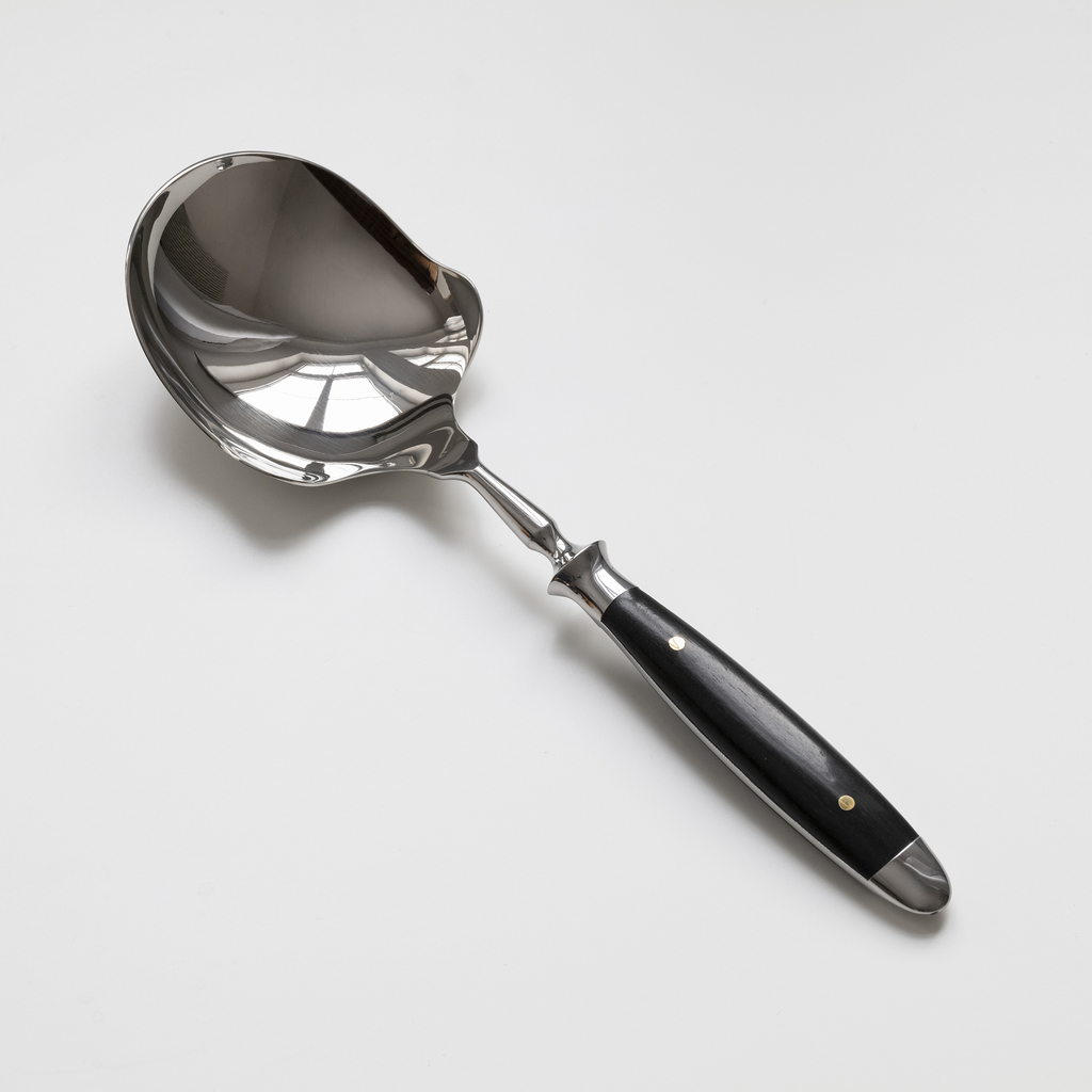 Grundlage für jedes einzelne Teil ist ein Stück rostfreien Chrom- Vanadium-Stahls, das von Hand geschmiedet und anschließend ebenfalls in mühevoller Handarbeit durch Schleifen und Polieren zur Perfektion gebracht wird. Auch von Hand werden die bauchigen Griffschalen aus Holz zugerichtet, die anschließend mit zwei wiederum von Hand gesetzten Messingnieten nahezu nahtlos mit der Verlängerung der Klinge verbunden werden. Die Gabelzinken sind einzeln rundgeschliffen und zugespitzt, um müheloses und schonendes Aufspießen zu ermöglichen, und für die Messerklingen kommt das Verfahren des Blaupließtens zur Anwendung: ausgiebiges Schleifen der Klinge bis zur feinstmöglichen Stufe, an dessen Ende eine extrem glatte Oberfläche mit bläulichem Schimmer entsteht. In der klassischen Ausführung sind die Griffschalen des Eichenlaub-Bestecks aus afrikanischem Ebenholz gefertigt: feinporig, dicht und von dunkler, nahezu schwarzer Farbe mit leichten, bräunlichen Streifen.