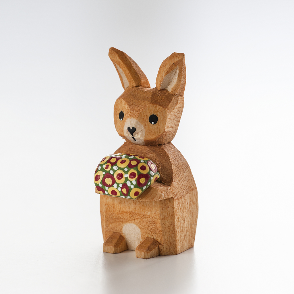 Osterhase und Ostereier sind für viele Menschen untrennbar mit dem Frühling verbunden. Der Osterhase, Symbol der Fruchtbarkeit und zu Ostern das Tier, das den Kindern die süßen Ostereier bringt, wird in liebevoller Handarbeit zum Leben erweckt. Unsere Osterhasenfamilie kommt aus der Holzschnitz- und Spielzeugwerkstatt Lotte Sievers-Hahn, wo bereits seit 1929 von spezialisierten Schnitzern Holzfiguren aus Lindenholz gemacht werden. Charakteristisch sind die sparsamen, großflächigen Schnitte, die den Figuren ein klares und schlichtes Aussehen geben. Anschließend werden die Figuren mit leuchtenden ungiftigen Ölfarben bemalt.