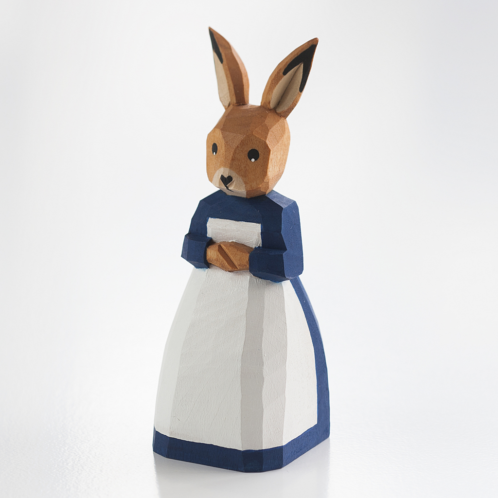 Osterhase und Ostereier sind für viele Menschen untrennbar mit dem Frühling verbunden. Der Osterhase, Symbol der Fruchtbarkeit und zu Ostern das Tier, das den Kindern die süßen Ostereier bringt, wird in liebevoller Handarbeit zum Leben erweckt. Unsere Osterhasenfamilie kommt aus der Holzschnitz- und Spielzeugwerkstatt Lotte Sievers-Hahn, wo bereits seit 1929 von spezialisierten Schnitzern Holzfiguren aus Lindenholz gemacht werden. Charakteristisch sind die sparsamen, großflächigen Schnitte, die den Figuren ein klares und schlichtes Aussehen geben. Anschließend werden die Figuren mit leuchtenden ungiftigen Ölfarben bemalt.