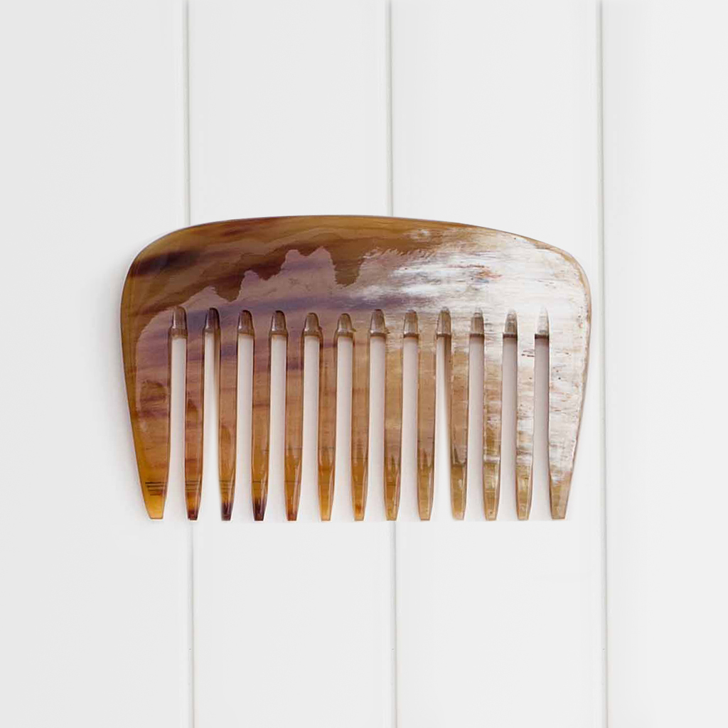 Horn ist das ideale Material für Kämme: Bei richtiger Bearbeitung können daraus Kämme entstehen, die fast wie von selbst durch das Haar gleiten, einen natürlichen Glanz ausstrahlen, bei guter Pflege enorm lange halten und mit der Zeit immer schöner werden. Diese Kämme stammen von einem der letzten Kammacher Deutschlands im mittelfränkischen Hartenstein. Auf teilweise über 100 Jahre alten Maschinen fertigt er ca. 60 Kämme pro Tag, die alle einzeln zugeschnitten werden müssen, von einer frühindustriellen Kammaschine mit Zähnen versehen und abschließend geschliffen und poliert werden. Da es sich bei Horn um ein gewachsenes Naturprodukt handelt, sind auch deutliche Abweichungen in Farbe und Zeichnung möglich – kein Kamm gleicht daher dem anderen.