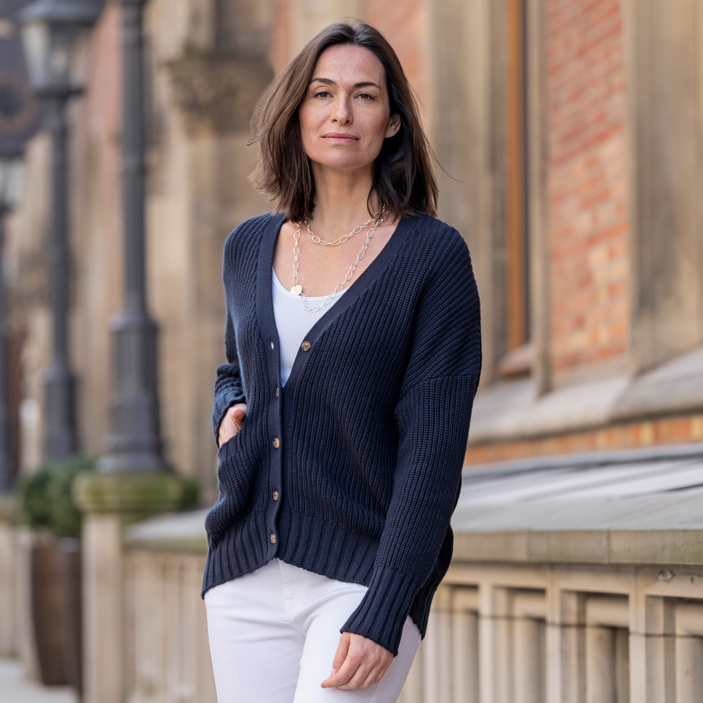 Dunkelblauer Cardigan in breitem Rippenstrick aus 85 % Baumwolle und 15 % Kaschmir – perfekt zum Mitnehmen und Überziehen, wenn nach einem warmen Tag noch ein kühler Abend zu erwarten ist. Breiter Rippenstrick am Saum und an den besonders lang ausgeführten Ärmelbündchen. Kleine, aufgesetzte Tasche auf der rechten Seite.