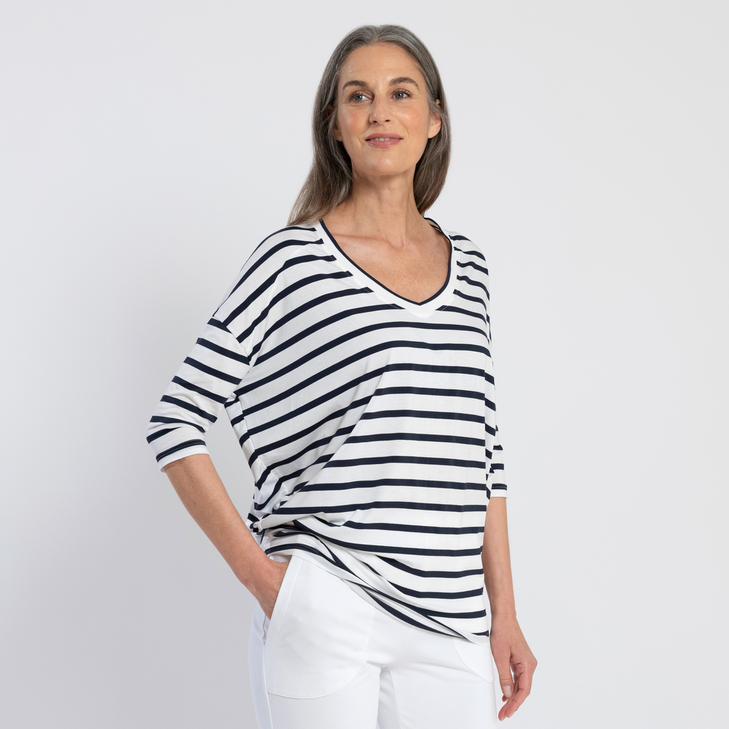 Pyjamashirt aus weichem Jerseystoff. Mit V-Ausschnitt, oben etwas weiter geschnitten und mit halb langem Arm.