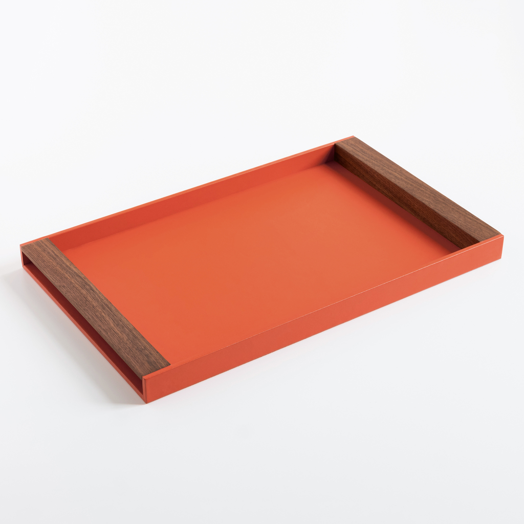 Tablett in moderner Schlichtheit, das komplett mit feingenarbtem italienischem Leder bezogen ist. Als besonderes Detail sind in die Schmalseiten zwei Griffleisten aus dunklem gemasertem Walnussholz eingepasst – nicht nur optisch, sondern auch haptisch eine Freude. Die Unterseite ist mit Velours kaschiert.