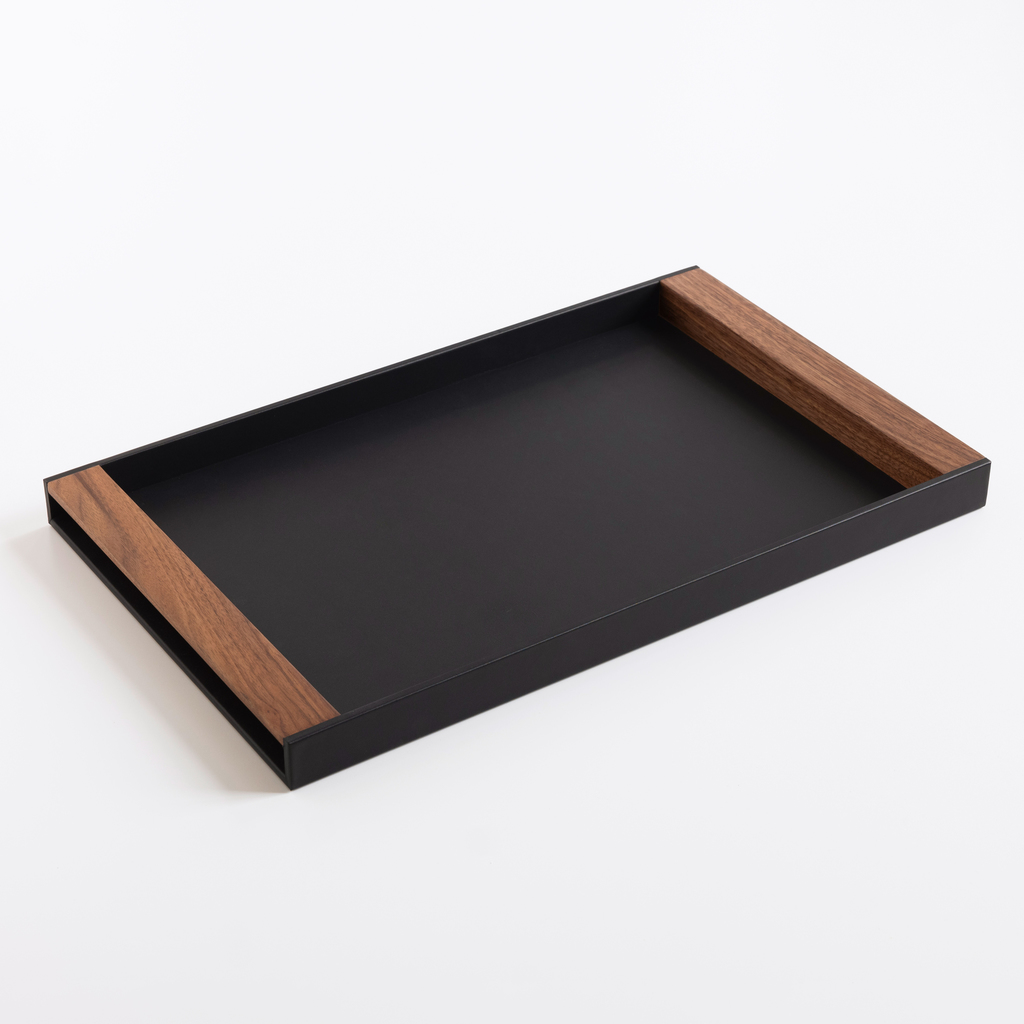 Tablett in moderner Schlichtheit, das komplett mit feingenarbtem italienischem Leder bezogen ist. Als besonderes Detail sind in die Schmalseiten zwei Griffleisten aus dunklem gemasertem Walnussholz eingepasst – nicht nur optisch, sondern auch haptisch eine Freude. Die Unterseite ist mit Velours kaschiert.